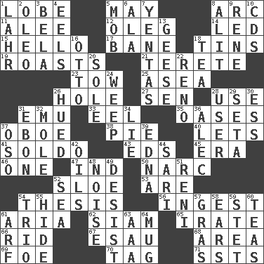 ACROSS 1. Ear part 5. Fifth month 8. Curve 11. Toward shelter 12. Cassini of fashion 14. Directed 15. Phone greeting 17. Object of repulsion 18. Canisters 19. Exposes to great heat 21. Cigar-shaped 23. Pull behind 25. At sea 26. Hollow 27. Elected rep. 28. Purpose 31. Australian flightless bird 33. Snakelike fish 35. Fertile tracts in a desert 37. Mitch Miller's instrument 38. Sliced dessert 40. Allows 41. Twentieth part of a lira 43. Begley and Asner 45. Period 46. Single 47. Working for oneself (abbr.) 50. Drug cop 52. _ gin 53. "We ___ not amused" (Victoria) 54. College paper 56. Swallow 61. Operatic vocal solo 62. Thailand, formerly 65. Feeling or showing extreme anger 66. To free from 67. He sold his birthright 68. Length times width 69. Enemy 70. Label 71. Fast planes DOWN 1. Cowardly lion portrayer 2. Butter sub 3. Actor Lugosi 4. Snakelike fish 5. Disorderly crowd 6. According to 7. Gossips 8. Set down 9. French philosopher Descartes 10. Music discs 13. Honkers 16. "Beetle Bailey" pooch 18. Beverage made from leaves 20. Not divided or shared with others 22. Former U.S. Attorney General Janet 24. Shed a tear 26. Became colored 28. One who uses or employs something 29. Stalk of a moss capsule 30. Curvy letter 31. Inky black, to poets 32. Undercover agent 34. Untruth 36. Actor Baldwin 37. Bear (Spanish) 39. Pulitzer Prize-winning author Ferber 42. Petroleums 44. Indian skirt 48. Annoying sound 49. Cease 51. Painter Guido (1575-1642) 52. Ocean 54. Musical group of three 55. Flintstone garb 57. Pate de foie ____ 58. Hearing organs 59. Proofreading order 60. Afternoon social gatherings 61. Sandy's bark 63. Auto club (abbr.) 64. Large cup
