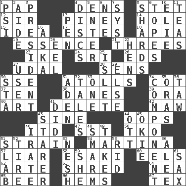 ACROSS 1. Infant food 4. Hiding places for outlaws 8. Proofreading order 12. Title for a knight 13. Abounding in pines 14. Hollow 15. The content of cognition 17. _____ Park, CO 18. Capital of Western Samoa 19. Core 21. Trios 23. D.D.E's nickname 24. _ Lanka 26. Begley and Asner 27. Freehold land 28. Elected reps. 30. Compass dir. 31. Ringlike coral islands and reefs 34. Small bed 37. Nine, plus one 38. Natives or inhabitants of Denmark 39. Mouth or opening 40. Nonscientific branch of learning 41. Keyboard key 42. Opening into something insatiable 43. Trig term 44. I made a mistake 46. It would 47. Fast jet (abbr.) 50. Ring climax 51. Put through a sieve 54. Chrissie's court nemesis 57. One who doesn't tell the truth 58. 1973 Nobel Price Winner (Physics) Leo 60. Snakelike fish 62. Johnson of "Laugh-In" 63. Fragment 64. Teachers' org. 65. Fermented drink made from hops 66. Folds over and sews together 67. John Ritter's dad DOWN 1. 23rd letter of the Greek alphabet 2. Assistant 3. Elected leader of a country 4. Plates 5. Keyboard key 6. Born 7. System (abbr.) 8. Broken pieces 9. Drinks excessively 10. Writer Wiesel 11. Afternoon social gatherings 13. Writing instrument 16. "____ silly question..." 20. Snakelike fish 22. Coop moms 25. Small island 27. One who makes use of a thing 29. Otherwise 30. R.R. building 31. An important port of Yemen 32. Falsehoods 33. Single 34. Piece 35. Mouths or openings 36. The 23rd letter of the Hebrew alphabet 41. "You Light Up My Life" star Conn 43. A viewer who gazes fixedly 44. Baseball player Mel 45. Migrant worker of the '30s 46. Feeling or showing extreme anger 48. Excessive but superficial compliments 49. Proceeds 51. Broad, flat, thick piece 52. Become fatigued 53. Delicate 55. To free from 56. Toward shelter 59. A female animal or person 61. Saxophone
