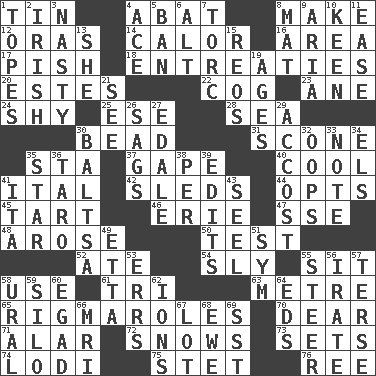 ACROSS 1. Shallow baking pan 4. Blind as ____ 8. Create 12. Mouths or openings 14. Bodily heat indicating an inflammation 16. Type of rug 17. Expression of disdain 18. Pleas 20. _____ Park, CO 22. Gear tooth 23. A saturated hydrocarbon 24. Like a shrinking violet 25. Compass dir. 28. Ocean 30. Necklace unit 31. Biscuitlike quick bread 35. R.R. building 37. Stare wonderingly 40. Calm and collected 41. Slanted text style (abbr.) 42. Bobsleighs 44. Elects 45. Small pie 46. One of the Great Lakes 47. Compass dir. 48. Came up 50. Trial 52. Had dinner 54. Cunning 55. Be seated 58. Purpose 61. Three (prefix) 63. Distance measurement (Brit.) 65. Complicated, petty procedures 70. Letter starter 71. Having or resembling wings 72. Frozen precipitation (plural) 73. Puts into a specified state 74. Farming town in central California 75. Proofreading order 76. Portuguese money of account (variant) DOWN 1. Drinks excessively 2. From or relating to Ireland 3. Offensive 4. Adept person 5. Prohibit 6. Keyboard modifier key 7. Torque (variant) 8. Floor protector 9. Roberta Peters solo 10. Peachy ____! 11. Comfort 13. A female animal or person 15. Vintage cars 19. Eras 21. Perceive with the eye 26. Sinks 27. Peak District village in England 29. Buttonhole 30. Greek mezzo-soprano Agnes 32. I made a mistake 33. Make mention of 34. Raised railways 35. Play the lead 36. Edible starchy tuberous root 38. For each 39. Proofreads 41. Call ___ day 43. Stitch closed the eyes of (a falcon) 49. Singer James 51. Symbol (abbr.) 53. Blunders 55. Bull 56. Feeling or showing extreme anger 57. Laconic 58. Mountain range 59. Grain storage tower 60. Mild oath 62. Charged atoms 64. Begley and Asner 66. Medical imaging device (abbr.) 67. Car dealer's back yard 68. She-sheep 69. Fast jet (abbr.)