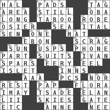 ACROSS 1. Actor Linden 4. Writing tablets 8. Label 11. Length times width 13. Free of sound 15. Chief or king in Benin or Nigeria 16. Having great length 17. Off limits 18. Loose flowing garment 19. Flexible twig of a willow tree 21. Ocean 22. Slanted text style (abbr.) 23. Elected rep. 24. Single 27. Floor covering 29. Inky black, to poets 30. Lean end of the neck 34. Player for Phoenix 36. United States Postal Service (abbr.) 39. Give a jingle 40. Component 41. Sets of matching outer garments 43. "Terrible" tsar 44. Practice fights 46. Suggestive of the supernatural 47. Snakelike fish 48. Small island 49. Lodging establishments 51. American Automobile Association (abbr.) 53. Personal Computers (abbr.) 54. And not 57. Repose 60. Infant food 63. Plants 65. "If ____ say so..." 66. Sadhe (variant) 69. Flair 70. Cards in a Roman deck? 71. Atmospheres 72. Yard entry 73. And so on (abbr.) 74. Singer Murray 75. Born DOWN 1. Saint headwear 2. Came up 3. Soviet premier 1918-24 4. Pacific Standard Time (abbr.) 5. "One Day ___ Time" 6. Rights 7. _ gin 8. A blast of a horn 9. Swedish rock group 10. Highlander 12. Ripen 14. Rich soil 18. Actors Guy, Robert Welles, and Clint 20. Director Reiner 25. Horse sense 26. Take place subsequently 28. Viper 29. Plea 31. Be footloose 32. Of or related to the anus 33. Commissioned military rank (abbr.) 34. Plant excrements 35. Mountain range 37. Sliced dessert 38. Empty completely 40. 23rd letter of the Greek alphabet 42. Synchronize (abbr.) 45. R.R. building 50. Science/research agcy. 52. Tenement units (abbr.) 54. Pitcher Ryan 55. Declaim 56. Indian princess (variant) 57. Cause heat under the collar 58. Send forth 59. Ketch in the Levant 61. "____ silly question..." 62. Ache 64. Part of a journey 67. Lair 68. Compass dir.