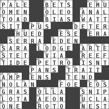 ACROSS 1. Diluted with white 5. Wagers 9. Australian flightless bird 12. Sign of something about to happen 13. Butter sub 14. Of or related to the anus 15. Frog relative 16. Prejudice 17. Electrical Unit 18. Be seated 19. Fluid product of inflammation 21. Prevent from occurring 22. Took on color 24. Compass dir. 26. Period 27. Spanish missionary in California 28. Locale of original sin 29. "Two Mules for Sister ____" 30. Inn 32. Johnson of "Laugh-In" 36. Proofreading order 37. By way of 38. Coral collection 39. Event that recurs at intervals 40. Stone: prefix 42. Is not 43. Baking dishes 44. Distinguishing feature 46. Electrical Unit 49. Followers of ems 50. Be inclined (to) 51. Pitcher Ryan 53. Enemy 54. Greek goddess of the dawn 57. Pate de foie ____ 58. Rounded earthenware pot or jar 61. Clip 62. Globular water bottle used in Asia 63. A really long time 64. Southern CA. univ. 65. Single 66. Printing process, for short 67. A home for chicks DOWN 1. Plant holders 2. Mine, in Marseilles 3. Resembling or made to resemble leather 4. Conclude 5. Moves up and down 6. Connecticut Ivy Leaguer 7. Beverage made from leaves 8. Distress signal 9. Related on the mother's side 10. Mother 11. Extreme 14. Deep reverence 19. For each 20. Freehold land 21. Lair 23. A salt of uric acid 24. _ Allan Poe 25. Observe 27. Suttee (variant) 28. Prepares for publication 29. Fast jet (abbr.) 31. Baking chambers 32. Believer in; advocate of (suffix) 33. Home 34. Portable shelter 35. Lizard (obsolete) 40. Baking dish 41. Von Bismarck 43. Fenced enclosure 45. Portuguese money of account (variant) 46. White American of non-Hispanic descent 47. Person of subnormal intelligence 48. Food holder 52. White ___ sheet 53. Papal veil 55. Lubricates 56. Argument over a trivial matter 58. Boat paddle 59. Lion 60. Car dealer's back yard 61. Player for Phoenix