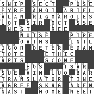 ACROSS 1. Clip 5. Religious group 9. Airs 13. Jane of fiction 14. Mine, in Marseilles 15. Satellite of Uranus 16. Actor Alda or Thicke 17. Complicated, petty procedures 19. Car dealer's back yard 20. Title for a knight 21. Sep. follower 22. Compass dir. 23. A home for chicks 25. To sift 26. Annoying sound 30. Corncob 34. Profane or obscene expressions 35. International (abbr.) 36. Composer Stravinsky 39. Prevent from occurring 42. Dutch treat 43. Lug 44. Principle of right and wrong 46. Flats, for short 47. Biscuitlike quick bread 48. Greek goddess of the dawn 51. Russian ruler of old 54. Take to court 57. Direct toward a target or goal 58. Nilotic language 60. Soap unit 62. Interpreter 65. Prong on a fork 66. Match 67. Heroin 68. Arabian gulf 69. Political cartoonist Thomas 70. Residence 71. Rendezvous DOWN 1. Lick closed 2. High-strength synthetic material 3. Feeling or showing extreme anger 4. Animal enclosure 5. Indian skirt 6. Arab leader 7. Gear tooth 8. The easternmost of the Lesser Sundas 9. Adept person 10. Petroleums 11. Observes 12. Otherwise 15. Johnson of "Laugh-In" 18. Adept person 20. Portico 24. Sounds asleep 27. It would 28. A female animal or person 29. _____ Park, CO 30. Parts 31. Indiana (abbr.) 32. Parent Teacher Association (abbr.) 33. Shade tree 36. Call ___ day 37. Grand Old Party 38. Baseball player Mel 40. And so on (abbr.) 41. 17th letter of the Greek alphabet 45. To the inside or interior of 48. Relaxation 49. Lubricate 50. Box-office sellout 52. Tolerate 53. The wife of a rajah (variant) 54. Comedian Laurel of Laurel & Hardy 55. Capital and largest city of Mongolia 56. Hearing organs 58. Rich soil 59. Goad 61. Monthly bill 63. Remaining after all deductions 64. Ring climax 65. Scottish cap