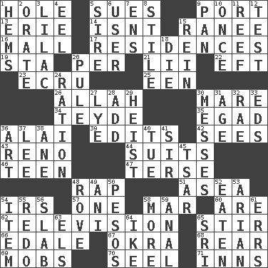 ACROSS 1. Hollow 5. Takes to court 9. Sweet dark-red dessert wine 13. 4th largest of the Great Lakes 14. Is not 15. The wife of a rajah (variant) 16. Promenade 17. Homes 19. R.R. building 20. For each 21. Cards in a Roman deck? 22. Newt 23. Shade of tan 25. Car or cant ending 26. Assad's deity 30. Female horse 34. Miss Universe 1986, Barbara Palacios _ 35. Mild oath 36. Jai _ 39. Proofreads 42. Perceives with the eye 43. Western Nevada city 44. Sets or collections 46. Adolescent 47. Laconic 48. Reproach for some lapse or misdeed 51. At sea 54. Big collection agency 57. Single 58. Third mo. 60. "We ___ not amused" (Victoria) 62. Household entertainment appliance 65. Agitate 66. Peak District village in England 67. Gumbo ingredient 68. Located in or toward the back 69. Disorderly crowds 70. Stitch closed the eyes of (a falcon) 71. Lodging establishments DOWN 1. Folds over and sews together 2. Speak pompously 3. Pale purple color 4. Snakelike fish 5. Title for a man of rank and authority 6. One who uses or employs something 7. Followers of ems 8. Vertical member of a panel or frame 9. Baking dish 10. At one time in the past 11. Coral ridge 12. Trial 15. It's straight from the horse's mouth 18. Pass on 20. Whine 24. Food allowance for one day 27. Potassium hydroxide 28. Find the sum of 29. Robbery 30. Makes clutter 31. Personal question 32. Actress Charlotte 33. Begley and Asner 36. Tate display 37. Area sheltered from the wind 38. A saturated hydrocarbon 40. Third day of the wk. 41. Title for a knight 45. Russian ruler of old 48. Be footloose 49. Black tropical American cuckoo 50. Mexican monetary units 52. Ingested 53. Believer in; advocate of (suffix) 54. A whole individual unit 55. Do over again 56. Thick slice 58. Greater amount 59. Of or related to the anus 61. Blunders 63. Raised railways 64. D.D.E's nickname 65. _ Lanka