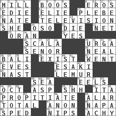 ACROSS 1. Place where flour is made 5. Scornful sounds 9. Greek god of love 13. Singer Brickell 14. Writer Wiesel 15. First-year military academy student 16. Nathan's nickname 17. Household entertainment appliance 19. A female animal or person 20. Bear (Spanish) 21. Expire 22. Fish or hair follower 23. NW Algerian seaport 25. Affirmative reply 26. Any of the three canals of the cochlea 30. Capital and largest city of Mongolia 34. Sir (Sp.) 35. Be tempered by heat 36. Indonesian resort city 39. Have an existence 42. Left 43. Nights before holidays 44. 1973 Nobel Price Winner (Physics) Leo 46. Political cartoonist Thomas 47. Arboreal primate 48. Ocean 51. Snakelike fish 54. Sep. follower 57. Viper 58. Quiet! 60. Call ___ day 62. Conciliate 65. Having or resembling wings 66. Add up to 67. Soon (poet.) 68. California wine valley 69. Moved rapidly 70. Pinches, bites 71. Painful DOWN 1. Not women's 2. Potato state 3. 61 cubic inches 4. Area sheltered from the wind 5. Stakes 6. Margarine 7. Petroleum 8. Shabby and untidy 9. Raised railways 10. It's straight from the horse's mouth 11. Mitch Miller's instrument 12. Transmitted 15. Sliced desserts 18. Compete 20. Single time 24. Aid 27. A saturated hydrocarbon 28. Brine-cured salmon 29. Satellite of Uranus 30. Undo the wiring of 31. To sift 32. Separate the seeds from cotton 33. The first octave above the treble staff 36. Benjamin's nick name 37. Actress Gardner 38. French article 40. Compass dir. 41. Scottish cap 45. Malaysian steamed pastry 48. Travel by water 49. Eastern Standard Time (abbr.) 50. Bee-related 52. Pale purple color 53. Staphylococcus 54. Chooses 55. Riding implement 56. Carry 58. Close up, plug up 59. Coop moms 61. Like ___ of sunshine 63. Writing tablet 64. Black tropical American cuckoo 65. Santa ___, CA