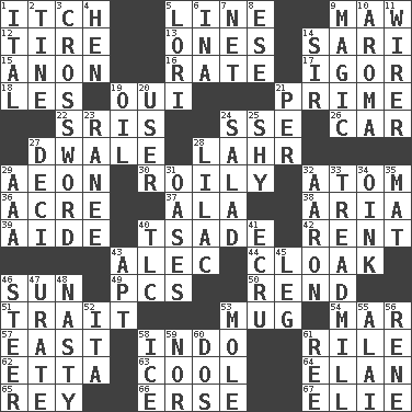 ACROSS 1. Hankering 5. Actor's bit 9. Opening into something insatiable 12. Become fatigued 13. Washington bills 14. Indian skirt 15. Soon (poet.) 16. Pace 17. Composer Stravinsky 18. French article 19. Fr. "Yes" 21. A-one 22. Indian titles of respect 24. Compass dir. 26. 4-wheeled motor vehicle 27. A sleeping potion; an opiate (poet.) 28. Cowardly lion portrayer 29. Period of immesurable duration 30. Turbulent 32. Smallest unit of an element 36. Measure of real estate 37. Chicken ___ king 38. Operatic vocal solo 39. Assistant 40. Sadhe (variant) 42. Monthly bill 43. Actor Baldwin 44. Loose outer garment 46. Player for Phoenix 49. Personal Computers (abbr.) 50. Tear apart 51. Distinguishing feature 53. Large cup 54. Impair 57. Compass direction 58. _ china 61. Cause heat under the collar 62. Singer James 63. Calm and collected 64. Enthusiasm 65. Marina Del _, California 66. Celtic language 67. Writer Wiesel DOWN 1. Slanted text style (abbr.) 2. Prong on a fork 3. What you're doing now 4. Layer 5. Australian parrot (variant) 6. _ tizzy (2 wds.) 7. Fish or hair follower 8. Compass dir. 9. Mysterious quality of enchantment 10. Odor 11. One who wires 14. Title for a knight 19. Lubricate 20. One who makes use of a thing 21. For each 23. Indian princess (variant) 24. Vegetable dish 25. Like a shrinking violet 27. Tenth: prefix 28. Pale purple color 29. Auto club (abbr.) 31. Fertile tracts in a desert 32. Composer Copland 33. Excercise machine 34. Pig sound 35. Floor protector 40. Affectionate concern, for short 41. Shade of tan 43. Fitting 45. Part of a journey 46. Guide 47. A salt of uric acid 48. Difficult 52. Call ___ day 53. Undercover agent 55. Jai _ 56. French philosopher Descartes 58. Frozen water 59. Not either 60. Two (Sp.) 61. To separate or throw off