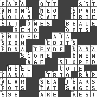 ACROSS 1. Dad 5. Baseball player Mel 8. Fast jet (abbr.) 11. Amid 13. Modern: prefix 14. Coast Guard woman 15. Pitcher Ryan 16. Domesticated feline 17. One of the Great Lakes 18. Be seated 19. Singles 21. Memphis, Tenn. Street 22. San ____ (Riviera town) 24. Elects 25. Worn away 27. "One Day ___ Time" 29. The Jewish people; Israel 30. Prepares for publication 32. Pulitzer Prize-winning author Ferber 33. Miss Universe 1986, Barbara Palacios _ 35. Nanny 39. Biscuitlike quick bread 41. Sign of things to come 42. Personal question 43. Had an oblique or slanted direction 45. Person who is morally reprehensible 48. ____ d'Azur (French Riviera) 49. Lessep's creation 50. Musical group of three 52. Reproach for some lapse or misdeed 55. Having or resembling wings 56. Ocean 57. Separates forcefully 59. Cooking vessels 60. Make lace 61. Gurus 62. Compass dir. 63. "We ___ not amused" (Victoria) 64. Relief DOWN 1. Baking dishes 2. Mine, in Marseilles 3. Coward 4. Santa ___, CA 5. At one time in the past 6. Afternoon social gatherings 7. Small child 8. Small fatty European fish 9. Travels by water 10. Relationship diagram 12. Dwarf 14. Ooze 20. Lower and raise head in agreement 21. Water vessel 23. Ferber et al. 25. Compass dir. 26. To free from 27. Find the sum of 28. Neckwear 30. Sight organ 31. Snout, nose 33. Coat; cloak 34. Compass dir. 36. Electrical Measurement 37. Born 38. Also 40. Give a ring to 43. _-fi 44. Plunders 45. Radiant circles of light 46. Maternal 47. Hearing organs 49. Smile enhancers 50. Rend 51. Assign a rank or rating to 53. Ancient Greek god of war 54. Inconspicuous attention getter 56. R.R. building 58. Hearing organ
