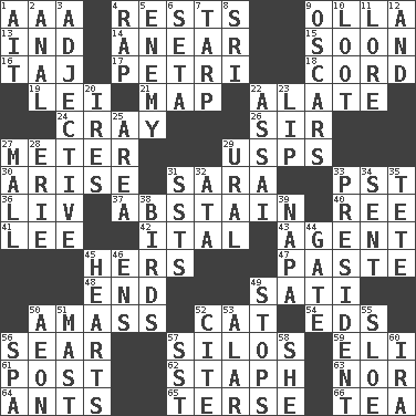 ACROSS 1. Auto club (abbr.) 4. Musical pauses 9. Water jar 13. Working for oneself (abbr.) 14. Approach 15. Within a short period 16. _ Mahal 17. _ dish (used to culture cells) 18. Drawstring 19. Luau accessory 21. Atlas unit 22. Having winglike extensions 24. Supercomputer manufacturer 26. Title for a knight 27. Distance measurement 29. United States Postal Service (abbr.) 30. Originate 31. "Two Mules for Sister ____" 33. Pacific Standard Time (abbr.) 36. 54 in ancient Rome 37. Choose not to consume 40. To riddle 41. Area sheltered from the wind 42. Slanted text style (abbr.) 43. Representative 45. Possessive pronoun 47. Thick mixture 48. Conclusion 49. Suttee (variant) 50. Collect or gather 52. Feline 54. Begley and Asner 56. Shrivel 57. Grain storage towers 59. Connecticut Ivy Leaguer 61. Mail 62. Staphylococcus 63. Not either 64. Pismires 65. Laconic 66. Beverage made from leaves DOWN 1. Small island 2. Of or related to the anus 3. Descriptive word 4. Hit sharply and swiftly 5. Foe 6. Bristle 7. Canvas cover 8. _ Lanka 9. Motion picture awards 10. Plunder 11. Old wives' tales, e.g. 12. Added to 20. Angers 22. Slender Brazilian palm 23. Mouth edge 25. Type of rug 27. Promenade 28. One of the Great Lakes 29. Mountain range 31. Fast planes 32. "One Day ___ Time" 33. Elected leader of a country 34. Posted 35. Wig 38. Avian creatures 39. California wine valley 44. Yard entry 45. Centers of feelings and intuitions 46. Followers of ems 49. Discontinues 50. Period of immesurable duration 51. Vertical spar for supporting sails 52. Quote 53. Having or resembling wings 55. A type of plum 56. Health resort 57. Fast jet (abbr.) 58. A female animal or person 60. Retirement account (abbr.)