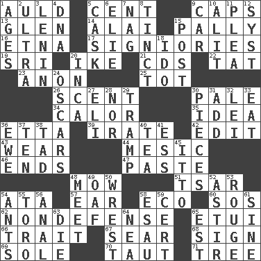 ACROSS 1. Old (Scot.) 5. Penny 9. Balmoral and tarboosh 13. Small, secluded valley 14. Jai _ 15. Chummy 16. Inactive volcano in Sicily 17. Seigniories (variant) 19. _ Lanka 20. D.D.E's nickname 21. Music discs 22. Make lace 23. Soon (poet.) 25. Small child 26. Odor 30. Light colored 34. Bodily heat indicating an inflammation 35. The content of cognition 36. Singer James 39. Feeling or showing extreme anger 42. Prepare for publication 43. Put on (as clothing) 44. Of or pertaining to a meson 46. Extremities 47. Thick mixture 48. Cut the grass 51. Russian ruler of old 54. _ moment's notice (2 wds.) 57. Ewer handle 58. Environmental prefix 60. Distress signal 62. Unrelated to defense, as in spending 65. Needle case 66. Distinguishing feature 67. Singe 68. Attach a signature 69. Flatfish 70. Drawn tight 71. Family _ (genealogy) DOWN 1. Matures 2. Extremist 3. Soviet premier 1918-24 4. Heredity factor (abbr.) 5. Keg 6. Writer Wiesel 7. Tired old horse 8. Colored lightly or faintly 9. Auto 10. Set down 11. Entreaty 12. System (abbr.) 15. Mail 18. Wedding promise 20. South American Indian 24. Motion picture awards 27. Connecticut Ivy Leaguer 28. And not 29. _____ steamer (cargo ship) 30. Parts 31. Find the sum of 32. Luau accessory 33. Consume 36. She-sheep 37. "___ Little Indians" 38. Small boy 40. Beverage made from leaves 41. Curvy letter 45. "Tell ____ the Marines!" 48. Confront 49. Clumsy lout 50. Obtain by seizing forcibly or violently 52. Having gotten out of bed 53. Makeup applied to the cheeks 54. Pismires 55. "Corrida" creature 56. Of or related to the anus 58. He sold his birthright 59. Foregone conclusion 61. Trig term 63. Pass on 64. Teachers' org. 65. Eastern Standard Time (abbr.)