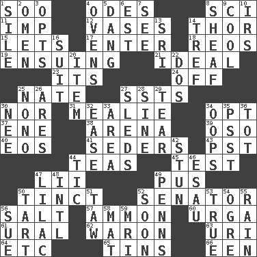 ACROSS 1. "Barney Miller" actor Jack 4. Lyric poems 8. _-fi 11. Mischievous child 12. Flower holders 14. Son of Odin 15. Allows 17. Keyboard key 18. Vintage cars 19. Following as a consequence or result 21. Standard of perfection 23. ___ a Wonderful Life 24. Not in operation 25. Nathan's nickname 27. Fast planes 30. Not either 31. Ear of corn 34. Choose 37. Compass dir. 38. Sports stadium 39. Bear (Spanish) 40. Greek goddess of the dawn 41. Spring feasts 43. Pacific Standard Time (abbr.) 44. Afternoon social gatherings 45. Trial 47. Cards in a Roman deck? 49. Fluid product of inflammation 50. A color or tint 52. Legislator 56. Table seasoning 57. ID or VA city 60. Capital and largest city of Mongolia 61. Mountain range 62. Make _____ (do battle with) 63. RI univ. 64. And so on (abbr.) 65. Metal containers 66. Car or cant ending DOWN 1. Drop; flow; fall 2. Presage 3. Chooses 4. Baking chambers 5. Mild oath, euphamism for damn 6. Eastern Standard Time (abbr.) 7. Observe 8. To gather and bind into a bundle 9. Calm and collected 10. Big collection agency 13. _ Lanka 14. Not kosher 16. Costume for a special activity 20. A distinct part 22. Two (Sp.) 25. Words to Nanette 26. Ancient Greek god of war 27. Bobsleighs 28. Trig term 29. Separate forcefully 30. Born 32. Comfort 33. Length times width 34. I made a mistake 35. Inconspicuous attention getter 36. Small child 42. Astound 44. Nervous spasm 46. Son of Isaac 47. Pale purple color 48. International (abbr.) 49. Actor Sean's family 50. Small pie 51. The 23rd letter of the Hebrew alphabet 52. Within a short period 53. Loyal 54. Legendary monster 55. Precipitation 56. Take to court 58. Floor covering 59. Medical imaging device (abbr.)