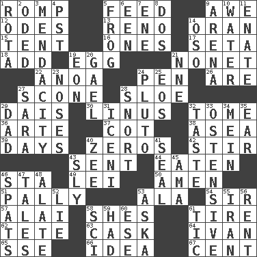 ACROSS 1. Play 5. Nourish 9. Deep reverence 12. Lyric poems 13. Former U.S. Attorney General Janet 14. Northwest Algerian city 15. Portable shelter 16. Washington bills 17. Stalk of a moss capsule 18. Find the sum of 19. Oval reproductive body of a fowl 21. Music written for nine 22. Small Philippine buffalo 24. Animal enclosure 26. "We ___ not amused" (Victoria) 27. Biscuitlike quick bread 28. A type of plum 29. Raised platform 30. "_ and Lucy" (Charlie Brown theme song) 32. Heavy book 36. Johnson of "Laugh-In" 37. Small bed 38. At sea 39. 24-hour periods 40. Nothings 42. Commotion 43. Transmitted 44. Eroded 46. R.R. building 49. Flowery wreath 50. So be it 51. Friendly 53. Wing 54. Title for a knight 57. Mountain range southwest of Kyrgyzstan 58. "______ My Girl" (Turtles hit) 61. Become fatigued 62. False hair 63. Keg 64. _ the terrible 65. Compass dir. 66. It may be bright or harebrained 67. Penny DOWN 1. Round or rotation of duties 2. Wrote a lyric poem 3. Ananias' fault 4. Pacific Standard Time (abbr.) 5. Tree-dwelling hopper 6. Car or cant ending 7. Compass dir. 8. Two (Sp.) 9. Sports stadium 10. Wetness 11. Related on the mother's side 14. Bear (Spanish) 19. Period of immesurable duration 20. Highlander 21. Compass dir. 23. Olfactory organs 24. Cartoon dog 25. Greek goddess of the dawn 27. "Two Mules for Sister ____" 28. Derisive sound 29. June honoree 31. Ancient Celtic tribe of eastern Britain 32. Clothes sense 33. Clearly or manifestly demonstrative 34. Chow _ 35. Hearing organ 40. Last letter of the English alphabet 41. Lick closed 43. Wily 45. Nursemaid (var.) 46. Arguments over trivial matters 47. Lies 48. Having winglike extensions 52. Untruth 53. "____ silly question..." 55. SW Asia republic 56. Monthly bill 58. _-fi 59. Possessed 60. Compass dir. 61. Nervous spasm