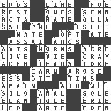 ACROSS 1. Greek god of love 5. Actor's bit 9. Enemy 12. Remainder 13. Singles 14. Stitched 15. Roll call or roster of names 16. Assign a rank or rating to 17. Rounded earthenware pot or jar 18. Compass dir. 19. Before (prefix) 21. Small island 22. Nathan's nickname 24. Choose 26. Had dinner 27. Slender Brazilian palm 28. Curves 29. Advice 30. Typical models 32. 43,560 square feet 36. Not recorded 37. Compete 38. Supercomputer manufacturer 39. Arabian gulf 40. Lacerates 42. Puff or smoke 43. Merit 44. Came up 46. Double-curved letter 49. Baseball player Mel 50. Airtight sealed metal containers 51. With great haste 53. Assist 54. Dripping 57. Grain storage tower 58. Of or related to the anus 61. Flatfish 62. Liveliness 63. Lacquered or enameled metalware 64. 4th largest of the Great Lakes 65. Directed 66. Johnson of "Laugh-In" 67. Genesis locale DOWN 1. Blunders 2. Vintage cars 3. Clearly or manifestly demonstrative 4. R.R. building 5. Old wives' tales, e.g. 6. _ tizzy (2 wds.) 7. Remaining after all deductions 8. Compass dir. 9. Chap (slang) 10. A small or young owl 11. Related on the mother's side 14. Distress signal 19. Parent Teacher Association (abbr.) 20. It's straight from the horse's mouth 21. It is 23. NE Netherlands city 24. Abalone 25. Personal Computers (abbr.) 27. Enthusiastic 28. Believer in; advocate of (suffix) 29. According to 31. Unconcealed 32. 13-14th century defensive garment 33. What you're doing now 34. Libertine 35. Sight organ 40. Make lace 41. Suttee (variant) 43. Period of immesurable duration 45. To free from 46. Artist's stand 47. Grin 48. First course 52. Electrically charged atom 53. Toward shelter 55. Writer Wiesel 56. Adolescent 58. _ moment's notice (2 wds.) 59. And not 60. Keyboard modifier key 61. Observe