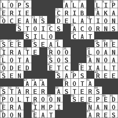 ACROSS 1. Chops off 5. In the manner of 8. Mouth edge 11. 4th largest of the Great Lakes 12. Baby bed with high sides 13. Alias (abbr.) 14. Seas 17. Accusation by an informer 19. Unemotional ones 21. Oak nuts 22. Grain storage tower 23. Domesticated feline 24. Observe 27. Lick closed 29. A female animal or person 32. Feeling or showing extreme anger 34. Friend of Pooh 36. Grant temporary use of 37. Globular water bottle used in Asia 38. Distress signal 39. Small Philippine buffalo 40. Wrote a lyric poem 41. And so on (abbr.) 42. Honor 43. Elected rep. 44. Plant excrements 46. To sift 47. American Automobile Association (abbr.) 50. Roll call or roster of names 52. A viewer who gazes fixedly 55. Michaelmas daisies 57. Coward 59. Oozed 62. Period 63. Body of Kaffir warriors 64. Billionth: prefix 65. Spanish title 66. Ingest 67. Ancient Greek god of war DOWN 1. Lion 2. The grampus (Milton) 3. Sliced desserts 4. Theater features 5. "We ___ not amused" (Victoria) 6. Pale purple color 7. Phillipine bananalike plant 8. Den 9. Visual representation of an object 10. Zero-star reviews 12. Music discs 15. Annoying sound 16. Drop; flow; fall 18. Small child 20. Unrefined 24. Grain storage towers 25. Wear away 26. Consumed 28. Plunders 29. Underwater navigation system 30. White Person, in Hawaii 31. Maternal 33. Bit 35. Motion picture awards 36. Not strict 42. First name in cosmetics 45. Plant holders 47. Nonscientific branch of learning 48. Nest on high 49. Scent 51. Sports stadium 52. Moved rapidly 53. "Corrida" creature 54. Actor Alda or Thicke 55. Cuckoo 56. Practice fight 58. Elect 60. Compass dir. 61. Two (Sp.)