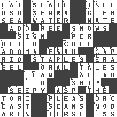 ACROSS 1. Consume 4. Chalkboard 9. Capri or Wight 13. Bear (Spanish) 14. Father Junipero _ 15. Small, secluded valley 16. Ocean 17. Wetness 18. Nathan's nickname 19. Say or write further 21. To separate or throw off 22. Frozen precipitation (plural) 24. Attach a signature 26. For each 27. Prevent from occurring 29. Algonquian 30. Scent 31. He sold his birthright 33. Head covering 36. River (Sp.) 37. Paper fasteners 40. Period 41. Snakelike fish 42. Relating to the mouth 43. Lies 45. Enthusiasm 47. Assad's deity 48. Hat (slang) 49. Sever or remove by pinching or nipping 50. Oozy 52. Viper 54. Definite Article 56. Torque (variant) 57. Entreaties 59. The grampus (Milton) 61. Compass direction 62. Actors Connery and Penn 63. Allow head to fall sleepily 64. Ancient Greek god of war 65. Laconic 66. Curvy letter DOWN 1. Greek goddess of the dawn 2. At sea 3. Inedible or poisonous agaric 4. Compass dir. 5. Acquire or gain knowledge or skills 6. Johnson of "Laugh-In" 7. Woody plant 8. Hearing organ 9. Snub 10. Cole _ (cabbage dish) 11. Allows 12. Compass dir. 20. South Vietnam president (1954) 22. Disorder 23. Born 25. Pate de foie ____ 27. Have the gumption 28. 4th largest of the Great Lakes 29. Give a ring to 31. Merit 32. Health resort 33. Portable communications device 34. Length times width 35. Romantic infatuation 38. Sycophant 39. Comedian Laurel of Laurel & Hardy 44. Came down and settled, as after flight 45. Chooses 46. Mouth edge 49. Connects, as a bridge 50. Fly high 51. Celtic language 52. Toward shelter 53. Burn superficially 55. Greek god of love 56. Beverage made from leaves 57. Pacific Standard Time (abbr.) 58. Compass dir. 60. Music discs