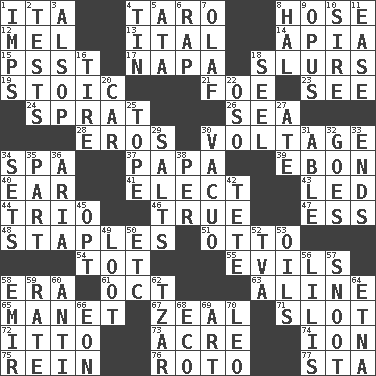 ACROSS 1. Call ___ day 4. Edible starchy tuberous root 8. Stockings 12. Cartoonist voice _ Blanc 13. Slanted text style (abbr.) 14. Capital of Western Samoa 15. Inconspicuous attention getter 17. California wine valley 18. Runs notes together 19. Unemotional 21. Enemy 23. Observe 24. Small fatty European fish 26. Ocean 28. Greek god of love 30. Electrical Measurement 34. Health resort 37. Dad 39. Inky black, to poets 40. Ewer handle 41. Choose 43. Directed 44. Musical group of three 46. Loyal 47. Double-curved letter 48. Paper fasteners 51. "Beetle Bailey" pooch 54. Small child 55. Vices 58. Period 61. Sep. follower 63. Place in a line 65. French painter Edouard 67. Ardor 71. Narrow, elongated depression 72. "Tell ____ the Marines!" 73. 43,560 square feet 74. Electrically charged atom 75. It's straight from the horse's mouth 76. Printing process, for short 77. R.R. building DOWN 1. Naughty children 2. Trials 3. Columnist Joseph or Stewart 4. Metal container 5. "One Day ___ Time" 6. Hit sharply and swiftly 7. Norwegian king 8. Actor Linden 9. Musical composition 10. Beget 11. Relaxation 16. Hoop that covers a wheel 18. Stitch closed the eyes of (a falcon) 20. 4-wheeled motor vehicle 22. Bear (Spanish) 25. Drink excessively 27. Had dinner 29. Table seasonings 30. In a vacuum (with "in") 31. Competent 32. Moves 33. Conclusions 34. Arranges properly for use 35. Piece 36. Operatic vocal solo 38. For each 42. Wig 45. Elect 49. Spoils 50. And so on (abbr.) 52. Federal power corp. 53. Petroleums 56. Ms. Damita and namesakes 57. Snob 58. Independent ruler or chieftain 59. Assign a rank or rating to 60. Opposed to 62. Russian ruler 64. Inactive volcano in Sicily 66. A really long time 68. Environmental prefix 69. Tate display 70. Lion
