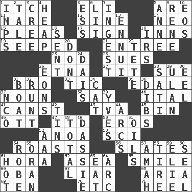 ACROSS 1. Hankering 5. Connecticut Ivy Leaguer 8. "We ___ not amused" (Victoria) 11. Female horse 12. Trig term 14. Modern: prefix 15. Entreaties 17. Attach a signature 18. Lodging establishments 19. Oozed 21. Main course 23. Dreamland 25. Takes to court 26. Inactive volcano in Sicily 27. Teat (slang) 28. Institute legal proceedings 31. Sis' sibling 33. Nervous spasm 35. Peak District village in England 37. Part of speech 38. Declare 40. Slanted text style (abbr.) 41. 2nd pers. sing. pres. of can (arch.) 43. Federal power corp. 45. Storage container 46. Baseball player Mel 47. It would 50. Greek god of love 52. Small Philippine buffalo 53. _-fi 54. Cooks with dry heat, as in an oven 56. Chalkboards 61. Israeli folk dance 62. Toward the sea 65. Grin 66. Chief or king in Benin or Nigeria 67. One who doesn't tell the truth 68. Operatic vocal solo 69. "___ Little Indians" 70. And so on (abbr.) 71. Person who is morally reprehensible DOWN 1. Naughty children 2. Story 3. Algonquian 4. Pile 5. Curvy letter 6. Cards in a Roman deck? 7. Consume 8. Queen of England 1702-14 9. French philosopher Descartes 10. Greek goddess of the dawn 13. World-weariness 16. Posted 18. Big collection agency 20. Do not 22. Wig 24. Raised platform 26. Immeasurably long periods of time 28. Suttee (variant) 29. ____ Bator 30. Snakelike fish 31. Water vessel 32. The smallest animal of a litter 34. Feline 36. Rights 37. Non-commissioned officer (abbr.) 39. Jacques Cousteau's middle name 42. Airtight sealed metal containers 44. Curves 48. Add up to 49. Hyrax 51. Lubricates 52. Auto club (abbr.) 54. Loose flowing garment 55. Northwest Algerian city 57. Nursemaid 58. Hoop that covers a wheel 59. Writer Wiesel 60. Lick closed 61. Being at a high temperature 63. Erode 64. Curve