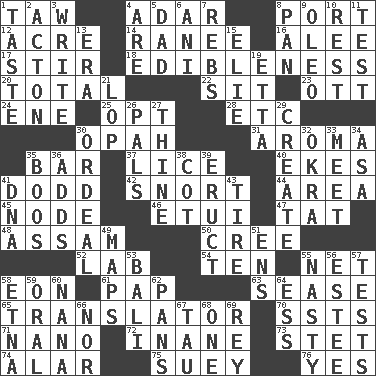 ACROSS 1. The 23rd letter of the Hebrew alphabet 4. The sixth month of the Jewish calendar 8. Left side of a ship or aircraft 12. 43,560 square feet 14. The wife of a rajah (variant) 16. Toward shelter 17. Commotion 18. The property of being fit to eat 20. Add up to 22. Be seated 23. Baseball player Mel 24. Compass dir. 25. Choose 28. And so on (abbr.) 30. Brightly colored fish 31. Odor 35. Soap unit 37. Louse (plural) 40. Makes supply last 41. Texas town _ City 42. Derisive sound 44. Type of rug 45. Connecting point 46. Needle case 47. Make lace 48. Indian state 50. Algonquian 52. Experiment locale 54. Nine, plus one 55. Remaining after all deductions 58. A really long time 61. Infant food 63. Gospel singer Marvin 65. Interpreter 70. Fast planes 71. Billionth: prefix 72. Lacking in sense or substance 73. Proofreading order 74. Having or resembling wings 75. Chop _ 76. Consenting reply DOWN 1. Clothes sense 2. NE Massachussets city 3. Compose 4. "We ___ not amused" (Victoria) 5. Male parent 6. Cuckoo 7. Confederate soldiers (slang) 8. Baking dish 9. Butter sub 10. Take ten 11. Trial 13. Period 15. Writer Wiesel 19. Singer James 21. Chop off 26. Friends 27. One or ones belonging to thee 29. Cause to be 30. Severe or trying experience 32. Gumbo ingredient 33. Rendezvous 34. White ___ sheet 35. Scornful sounds 36. Sums up 38. Small bed 39. Spew [out] 41. Heredity factor (abbr.) 43. Hoop that covers a wheel 49. Atlas contents 51. Followers of ems 53. Indonesian resort city 55. Difficult 56. First name in cosmetics 57. Trials 58. Inactive volcano in Sicily 59. Taken by mouth 60. Grandmother 62. Baking dishes 64. Curvy letter 66. And not 67. The 19th letter of the Greek alphabet 68. Single 69. Marina Del _, California