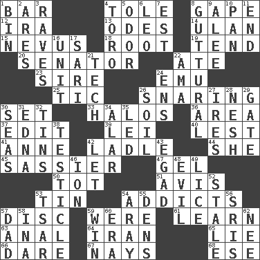 ACROSS 1. Oblong piece of solid material 4. Lacquered or enameled metalware 8. Yawn 12. Retirement account (abbr.) 13. Lyric poems 14. ____ Bator 15. Congenital growth or mark on the skin 18. Carrot, for example 19. Look after 20. Elected representative 22. Had dinner 23. Beget 24. Australian flightless bird 25. Nervous spasm 26. Catching in a trap 30. Put into a specified state 33. Radiant circles of light 36. Type of rug 37. Prepare for publication 39. Flowery wreath 40. For fear that 41. Queen of England 1702-14 42. Dipping utensil 44. A female animal or person 45. More impudent 47. Set 50. Small child 51. Opinion 53. Shallow baking pan 54. Inveterate users 57. Compact _ 59. Past tense of be (plural) 61. Acquire or gain knowledge or skills 63. Of or related to the anus 64. SW Asia republic 65. Falsehood 66. Have the gumption 67. Negative votes 68. Compass dir. DOWN 1. Storage container 2. Ancient Greek god of war 3. All-night dance parties 4. "Corrida" creature 5. Aroma 6. Lion 7. Eastern Standard Time (abbr.) 8. From the throat 9. Toward shelter 10. Baking dish 11. Conclusion 16. A single undivided whole 17. Indian skirt 21. Technician 22. Housemaid (var.) 24. Followers of ems 26. Land 27. Angers 28. Delicate 29. Yard entry 30. Oceans 31. Pulitzer Prize-winning author Ferber 32. Metal containers 34. Having or resembling wings 35. Directed 38. One of the two male reproductive glands 42. Allow 43. Mild oath 46. Electrically charged atom 48. Tending to cause great harm 49. Louse (plural) 52. Lacking originality or spontaneity 53. Russian ruler of old 54. Like ___ of sunshine 55. Hiding places for outlaws 56. Indian titles of respect 57. June honoree 58. _ tizzy (2 wds.) 59. Victory 60. Period 62. Born