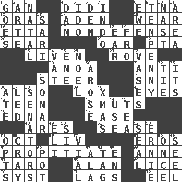 ACROSS 1. Separate the seeds from cotton 4. "You Light Up My Life" star Conn 8. Inactive volcano in Sicily 12. Mouths or openings 14. Arabian gulf 15. Put on (as clothing) 16. Singer James 17. Unrelated to defense, as in spending 20. Burn superficially 21. Boat paddle 22. Parent Teacher Assoc. 23. Make or become more lively 27. Be footloose 29. Small Philippine buffalo 31. Against 34. Navigate 35. In a ____ (agitated or irritated) 36. In addition 39. Brine-cured salmon 41. Snake ____ (dice throw) 42. Adolescent 43. Particles of soot 46. Pulitzer Prize-winning author Ferber 47. Relaxation 48. Ancient Greek god of war 51. Gospel singer Marvin 54. Sep. follower 56. 54 in ancient Rome 58. Greek god of love 61. Conciliate 66. Queen of England 1702-14 67. Edible starchy tuberous root 68. Actor Alda or Thicke 69. Louse (plural) 70. System (abbr.) 71. Fails to keep up a pace 72. Snakelike fish DOWN 1. Moves 2. Johnson of "Laugh-In" 3. Brizilian seaport 4. Daniel's nick name 5. Wedding promise 6. Lair 7. Southeast Asian peninsula 8. She-sheep 9. 3-inch nail 10. Political cartoonist Thomas 11. Length times width 13. Indian skirt 18. Hearing organ 19. Back 24. Large container 25. Compass dir. 26. Christmas carol 28. Flower holders 30. Came up 32. Neckwear 33. ___ a Wonderful Life 34. Echolocation 36. Had dinner 37. Directed 38. Legislators 40. Dec. holiday 44. Purpose 45. Beverage made from leaves 49. Biblical high priest 50. Be seated 52. Lick closed 53. Bert's buddy 54. Elects 55. Supercomputer manufacturer 57. Small bottle 59. Single time 60. Stitch closed the eyes of (a falcon) 62. Cooking vessel 63. In the manner of 64. Label 65. Followers of ems