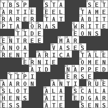 ACROSS 1. Cook's measure (abbr.) 5. R.R. building 8. Put into a specified state 11. Nick name for Arthur 13. Snakelike fish 14. Not wild 15. Less widely known 16. Make lace 17. "This won't hurt ____!" 18. Parent Teacher Association (abbr.) 19. Mouths or openings 21. Compose 22. Periodic rise and fall of the sea level 24. Immeasurably long periods of time 25. Main course 27. Third mo. 29. Small Philippine buffalo 30. Flower holders 32. Monthly bill 33. N. Chile seaport 35. Story 39. Bert's buddy 41. Presage 42. Help 43. Slept 45. Native american tent (variation) 48. Celtic language 49. Composer Copland 50. Against 52. Sorrow 55. Position in a hierarchy or organization 56. Insect wing 57. Any of the three canals of the cochlea 59. Coop moms 60. Small island 61. _ Allan Poe 62. Curvy letter 63. Had dinner 64. Elected reps. DOWN 1. Canvas cover 2. Naughty child 3. Ski resort town in Vermont 4. Sliced dessert 5. Stalk of a moss capsule 6. Afternoon social gatherings 7. The first octave above the treble staff 8. Unit of acoustic absorption 9. Sends forth 10. False hair 12. Wear away 14. Pacific island yam 20. Portuguese money of account (variant) 21. Past tense of be (plural) 23. Feeling or showing extreme anger 25. Hearing organ 26. Compass dir. 27. Big _ 28. White ___ sheet 30. Compete 31. Discontinues 33. Black tropical American cuckoo 34. To free from 36. Electrical Measurement 37. Area sheltered from the wind 38. Conclude 40. Precipitation 43. Remaining after all deductions 44. Get up 45. Lies 46. Metal shackles 47. Cooking vessels 49. American tennis player Robert 50. Came down and settled, as after flight 51. Nathan's nickname 53. Uhlan (variant) 54. Hearing organs 56. Auto club (abbr.) 58. Music discs