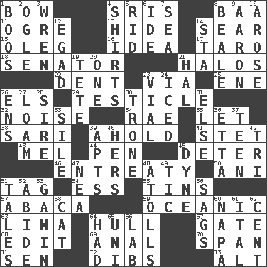 ACROSS 1. Arrow shooter 4. Indian titles of respect 8. Sound made by sheep 11. Legendary monster 13. Flintstone garb 14. Wither 15. Cassini of fashion 16. The content of cognition 17. Pacific island yam 18. Legislator 21. Auras 22. Undesirable depression on a surface 23. By way of 25. Compass dir. 26. Raised railways 29. A testis 32. Annoying sound 34. Actress Charlotte 35. Allow 38. Indian skirt 39. Hold, grip (Informal) 41. Proofreading order 43. Cartoonist voice _ Blanc 44. Animal enclosure 45. Prevent from occurring 46. Plea 50. Cuckoo 51. Label 54. Curvy letter 55. Canisters 57. Phillipine bananalike plant 59. Pertaining to the sea 63. Pale green bean 64. Frame or body of a ship 67. Yard entry 68. Prepare for publication 69. Of or related to the anus 70. Connect, as a bridge 71. Elected rep. 72. Claim 73. Keyboard modifier key DOWN 1. Scornful sounds 2. Stare 3. Songbird 4. Upper-body garments 5. To free from 6. Binary compound 7. Ocean 8. Memphis, Tenn. Street 9. Composer Copland 10. Came up 12. Mild oath 14. R.R. building 19. False hair 20. Single 21. Actor Linden 23. Small bottle 24. On the rocks 26. Followers of ems 27. Rich soil 28. The founder of a family 30. Heavy duty weighing machine 31. Otherwise 33. Filth; sediment 36. Singer James 37. Adolescent 39. Tenement units (abbr.) 40. Possessive pronoun 42. Three (prefix) 45. Unit of force 47. Teachers' org. 48. Ringlike coral islands and reefs 49. Nervous spasm 51. Stories 52. Remain 53. Homeless child 56. Settles 58. Domesticated feline 60. California wine valley 61. Slanted text style (abbr.) 62. Penny 64. Possessed 65. Corn or form start 66. Experiment locale