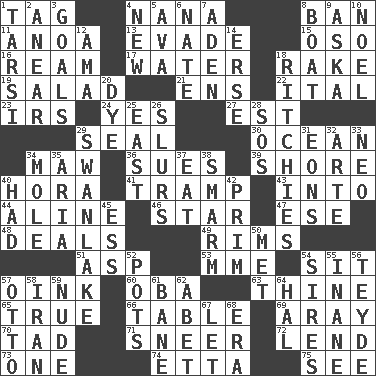 ACROSS 1. Label 4. Grandmother 8. Forbid 11. Small Philippine buffalo 13. Dodge 15. Bear (Spanish) 16. 480, 500 or 516 sheets of paper 17. Wetness 18. Immoral or dissolute person 19. Vegetable dish 21. Followers of ems 22. Slanted text style (abbr.) 23. Big collection agency 24. It is so 27. Eastern Standard Time (abbr.) 29. Lick closed 30. Sea 34. Opening into something insatiable 36. Institutes legal proceedings 39. Dinah or Pauly 40. Israeli folk dance 41. _____ steamer (cargo ship) 43. To the inside or interior of 44. Place in a line 46. Play the lead 47. Compass dir. 48. Allots cards 49. Basketball hoops 51. Cleo's killer 53. Madame (abbr.) 54. Be seated 57. Pig sound 60. Chief or king in Benin or Nigeria 63. One or ones belonging to thee 65. Loyal 66. Eating place 69. Like ___ of sunshine 70. Bit 71. Contemptuous expression 72. Grant temporary use of 73. Single 74. Singer James 75. Observe DOWN 1. Tarsus (plural) 2. Approach 3. Finish lines 4. ___ Haven, CT 5. Actress Gardner 6. Nathan's nickname 7. An important port of Yemen 8. Water vessel 9. "____ silly question..." 10. Christmas carol 12. Nursemaid (var.) 14. Celtic language 18. Actors Guy, Robert Welles, and Clint 20. Color 25. 90 degrees 26. Runs notes together 28. Mayday 29. Tchaikovsky ballet 31. Immeasurably long periods of time 32. Johnson of "Laugh-In" 33. Modern: prefix 34. Undercover agent 35. Roberta Peters solo 37. Consume 38. Excessive but superficial compliments 40. Possessed 42. Demure 45. Double-curved letter 50. Was introduced to 52. Plant holders 54. Male parents of animals 55. Lacking in sense or substance 56. Miss Universe 1986, Barbara Palacios _ 57. "Beetle Bailey" pooch 58. SW Asia republic 59. Naked 61. Object of repulsion 62. Collude with 64. Actor Linden 67. Allow 68. Epoch