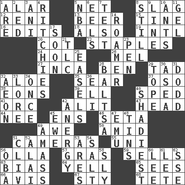 ACROSS 1. Having or resembling wings 5. Remaining after all deductions 8. Volcanic refuse 12. Painter Guido (1575-1642) 13. Fermented drink made from hops 15. Prong on a fork 16. Prepares for publication 18. In addition 19. International (abbr.) 20. Small bed 22. Paper fasteners 24. Opening into or through something 26. Cartoonist voice _ Blanc 27. South American Indian 28. Benjamin's nick name 29. Bit 32. Medicinal plant 35. Scorch 37. Bear (Spanish) 38. Immeasurably long periods of time 39. Pipe bend 40. Hurried 41. The grampus (Milton) 42. Came down and settled, as after flight 43. Froth on beer 44. Born 45. Followers of ems 46. Stalk of a moss capsule 49. Deep reverence 50. Among 51. Devices for capturing images 55. Corn or form start 56. Spanish pot 57. Pate de foie ____ 59. Makes a sale 63. Prejudice 64. Shout 65. Perceives with the eye 66. Opinion 67. Filthy place 68. False hair DOWN 1. "We ___ not amused" (Victoria) 2. Directed 3. Cuckoo 4. Actors Guy, Robert Welles, and Clint 5. Basketball assoc. 6. Snakelike fish 7. Trial 8. Free of sound 9. Actor's bit 10. Pismires 11. Set 14. Nomad 17. Within a short period 21. Affectionate concern, for short 23. Fenced enclosure 25. Artist's stands 28. Greek mezzo-soprano Agnes 29. Drink excessively 30. At sea 31. Texas town _ City 32. A really long time 33. Old wives' tales, e.g. 34. At one time in the past 36. Biblical high priest 40. Most dubious of character or honesty 42. Disorder of the immune system 45. She-sheep 47. Australian flightless bird 48. Metal containers 49. Collect or gather 51. 154 in Roman numerals 52. Jai ____ 53. Ancient Greek god of war 54. Table seasoning 56. Chief or king in Benin or Nigeria 58. Mischievous 60. Area sheltered from the wind 61. Allow 62. Compass dir.