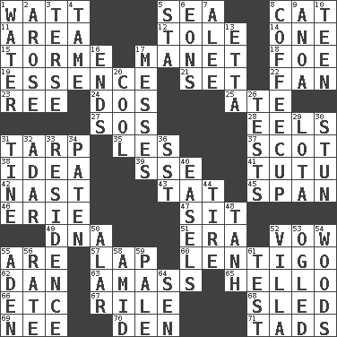 ACROSS 1. Electrical Unit 5. Ocean 8. Domesticated feline 11. Length times width 12. Lacquered or enameled metalware 14. Single 15. Singer Mel 17. French painter Edouard 18. Enemy 19. Center 21. Arrange properly for use 22. Air blower 23. To sift 24. Two (Sp.) 25. Had dinner 27. Distress signal 28. Snakelike fish 31. Canvas cover 35. French article 37. Highlander 38. The main thing one is thinking about 39. Compass dir. 41. Ballerina skirt 42. Political cartoonist Thomas 43. Make lace 45. Connect, as a bridge 46. One of the Great Lakes 47. Be seated 49. Heredity factor (abbr.) 51. Period 52. Promise 55. "We ___ not amused" (Victoria) 57. Pet locale 60. Small, flat, pigmented spot on the skin 62. One of the 12 tribes of Israel 63. Collect or gather 65. Phone greeting 66. And so on (abbr.) 67. Cause heat under the collar 68. Downhill vehicle 69. Born 70. Lair 71. Small boys DOWN 1. Wetness 2. Came up 3. Laconic 4. Docile 5. R.R. building 6. Immeasurably long periods of time 7. Toward shelter 8. Java holder (2 wds.) 9. Small Philippine buffalo 10. Adolescent 13. Singer James 16. Extremities 17. Makes clutter 20. Calm and collected 26. Trials 29. Globular water bottle used in Asia 30. Surprise greatly 31. Prong on a fork 32. The sixth month of the Jewish calendar 33. Dwelling 34. Eucharist need 36. Fast jet (abbr.) 40. Artist's stands 44. Hoop that covers a wheel 48. Hyperbolic tangent 50. Having or resembling wings 52. Country residence 53. Stared at amorously 54. Forest 55. Arabian gulf 56. Pace 58. Among 59. Diluted with white 61. Trial 64. Elected rep.
