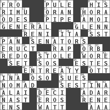 ACROSS 1. Back 4. Whine 8. Part of HMS, perhaps 11. Tall New Zealand timber tree 13. NW Algerian seaport 14. Israeli folk dance 15. Lyric poems 16. Corncob 17. Mine, in Marseilles 18. Commissioned military rank 21. American astronaut and politician John 22. Painter Guido (1575-1642) 23. Call ___ day 25. Fast jet (abbr.) 26. Baking dish 29. Legislators 32. Spew [out] 34. Strike 35. Globe 38. Redecorate 39. Took without asking 41. Had on 43. Put into a specified state 44. Distress signal 45. _____ Park, CO 46. Plea 50. Baseball player Mel 51. _ tizzy (2 wds.) 54. Bear (Spanish) 55. Institutes legal proceedings 57. Wanderer 59. French poetic form 63. Jai ____ 64. Tenth: prefix 67. The sixth month of the Jewish calendar 68. Political cartoonist Thomas 69. Greek god of love 70. French philosopher Descartes 71. Followers of ems 72. Electrical Unit 73. American Automobile Association (abbr.) DOWN 1. Tree-dwelling hopper 2. Travel on or in a vehicle 3. Sign of something about to happen 4. Cotton for raincoats, e.g. 5. RI univ. 6. Pet locale 7. Compass dir. 8. Residences 9. Metal shackles 10. Inhabitant of Heaven 12. One who makes use of a thing 14. Actor Linden 19. State of inaction 20. A saturated hydrocarbon 21. Slender fish 23. Slanted text style (abbr.) 24. Drink excessively 26. For each 27. Ancient Greek god of war 28. Naked 30. Came up 31. Sty mamas 33. ____ d'Azur (French Riviera) 36. Printing process, for short 37. Cy Young winner Saberhagen 39. Fast planes 40. "Corrida" creature 42. Eastern Standard Time (abbr.) 45. Sight organs 47. Allow head to fall sleepily 48. Aid 49. Third day of the wk. 51. Empty; void 52. Pitcher Ryan 53. Collect or gather 56. Play the lead 58. Small island 60. The main thing one is thinking about 61. Nanny 62. Type of rug 64. Morning condensation 65. Epoch 66. Small bed