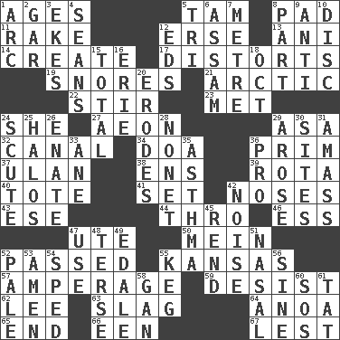 ACROSS 1. Eras 5. Scottish cap 8. Groovy apt. 11. Immoral or dissolute person 12. Celtic language 13. Black tropical American cuckoo 14. Cause to be 17. What propaganda does 19. Sounds asleep 21. Northern region 22. Agitate 23. Was introduced to 24. A female animal or person 27. A really long time 29. White ___ sheet 32. Lessep's creation 34. ___ good deed 36. Demure 37. ____ Bator 38. Followers of ems 39. Roll call or roster of names 40. Carry 41. Arrange properly for use 42. Olfactory organs 43. Compass dir. 44. Through, poetically 46. Curvy letter 47. Shoshoni 50. Count _ (2 wds.) 52. Went by 55. Sunflower state 57. Electrical Measurement 59. Stop 62. Area sheltered from the wind 63. Volcanic refuse 64. Small Philippine buffalo 65. Conclude 66. Car or cant ending 67. For fear that DOWN 1. Curve 2. Slender fish 3. Supplements with great effort 4. Seines 5. Three (prefix) 6. Indian state 7. Distance measurement (Brit.) 8. Component 9. Against 10. Compact _ 12. Begley and Asner 15. Add up to 16. 4th largest of the Great Lakes 18. Sep. follower 20. Eats (away) 24. Snake scale 25. Radiant circles of light 26. Related on the mother's side 28. Music written for nine 29. Came up 30. Locates 31. Collect or gather 33. A saturated hydrocarbon 35. Respiratory problem 36. Adept person 42. Annoying sound 45. Tear apart 47. Purpose 48. Laconic 49. Peak District village in England 51. Rhinal 52. Light colored 53. So be it 54. Broke a traffic law 55. Cask 56. Trig term 58. Separate the seeds from cotton 60. Distress signal 61. Make lace