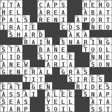 ACROSS 1. Call ___ day 4. Smile enhancers 8. San ____ (Riviera town) 12. Cartoonist voice _ Blanc 13. Length times width 14. Blind as ____ 15. Friends 17. Painter Guido (1575-1642) 18. To the left, to Queeg 19. Feeling or showing extreme anger 21. Music discs 23. Modern: prefix 24. Pottery fragment 26. Alias (abbr.) 28. Precipitation 30. Catching in a trap 34. R.R. building 37. Object of repulsion 39. Instrument 40. Hat (slang) 41. Fur scarf 43. Compass dir. 44. Afresh 46. Operatic vocal solo 47. Manchild 48. Commissioned military rank 51. Pate de foie ____ 54. Teat (slang) 55. Titles for men of rank and authority 58. Ingest 61. Commissioned military rank (abbr.) 63. Amusement-park features 65. Slender Brazilian palm 67. Toward shelter 71. Fastener 72. Oceans 73. Shout 74. "One Day ___ Time" 75. Canvas cover 76. Land 77. Fast jet (abbr.) DOWN 1. Body of Kaffir warriors 2. Pulls apart 3. Assad's deity 4. Auto 5. "We ___ not amused" (Victoria) 6. Fenced enclosure 7. Ketch in the Levant 8. Strike 9. Inky black, to poets 10. Female horse 11. "Beetle Bailey" pooch 16. Play the lead 18. "____ silly question..." 20. Period 22. One of the 12 tribes of Israel 25. Claim 27. Tate display 29. Relating to or accompanying birth 30. Major League Baseball Commissioner Bud 31. Charged particles 32. Words to Nanette 33. Small, secluded valley 34. Volcanic refuse 35. Prong on a fork 36. Arabian gulf 38. And not 42. Hearing organs 45. Dripping 49. Swiss mountan, "Queen of the Mountains" 50. Had dinner 52. Wind 53. Indian titles of respect 56. Ferber et al. 57. Theater features 58. Compass direction 59. Toward the sea 60. Russian ruler of old 62. Negative votes 64. Petty quarrel 66. Viper 68. Lion 69. Biblical high priest 70. Pipe bend