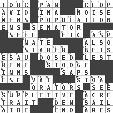 ACROSS 1. Torque (variant) 5. Baking dish 8. Hoof sound 12. Enthusiastic 13. _ tizzy (2 wds.) 14. Annoying sound 15. Not women's 16. Census information 19. Followers of ems 20. Legislator 21. Sew up the eyelids of hawks and falcons 23. And so on (abbr.) 24. Viper 27. Nathan's nickname 30. In addition 31. A viewer who gazes fixedly 34. Antes 35. He sold his birthright 38. Administered medicine 40. For fear that 41. French philosopher Descartes 42. Moe Howard, for one 44. Lodging establishments 45. Plant excrements 46. Compass dir. 47. Large container 50. Portico 53. Speakers 57. Observe 59. Supplying deficiencies 63. 43,560 square feet 64. Distinguishing feature 65. Lair 66. Move on water 67. Helper 68. Conclude 69. Ancient Greek god of war DOWN 1. Not wild 2. Baking chambers 3. Remove soap 4. Music discs 5. Corncob 6. At once, immediately (arch.) 7. California wine valley 8. Small bed 9. Cards in a Roman deck? 10. Bear (Spanish) 11. Animal enclosure 14. Drug cop 17. Shoshoni 18. Car dealer's back yard 20. Narrow board 22. Follows as a consequence or result 24. Toward shelter 25. Fast planes 26. Mail 28. Small boy 29. Greek god of love 30. Most capable 32. Eastern Standard Time (abbr.) 33. Vintage cars 35. One of the Great Lakes 36. Elected reps. 37. Singer Murray 39. ___ good deed 43. Global Positioning Systems (abbr.) 47. Electrical Unit 48. "We ___ not amused" (Victoria) 49. Make lace 51. Motion picture award 52. Nest on high 54. Event that recurs at intervals 55. Baking chamber 56. Tear apart 58. Snakelike fish 59. R.R. building 60. RI univ. 61. Groovy apt. 62. Sliced dessert 63. White ___ sheet