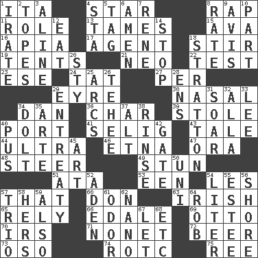 ACROSS 1. Call ___ day 4. Play the lead 8. Strike 11. Hero or heavy, e.g. 13. Domesticates 15. Actress Gardner 16. Capital of Western Samoa 17. Representative 18. Tumult 19. Portable shelters 21. Modern: prefix 22. Trial 23. Compass dir. 24. Make lace 27. For each 29. Jane of fiction 30. Relating to the nose 34. Daniel's nick name 36. Burn to charcoal 39. Fur scarf 40. Sweet dark-red dessert wine 41. Former Milwaukee Brewers owner Bud 43. Story 44. Extremist 46. Inactive volcano in Sicily 47. Mouth or opening 48. Bull 49. Make senseless or dizzy 51. "One Day ___ Time" 53. Car or cant ending 54. French article 57. Not this but _ 60. Spanish title 63. From or relating to Ireland 65. Depend 66. Peak District village in England 69. "Beetle Bailey" pooch 70. Big collection agency 71. Music written for nine 72. Fermented drink made from hops 73. Bear (Spanish) 74. College mil. group 75. To riddle DOWN 1. Feeling or showing extreme anger 2. Drinks excessively 3. Place in a line 4. R.R. building 5. Label 6. So be it 7. French philosopher Descartes 8. Pace 9. Deliberation 10. Role in a play 12. Ingest 14. Discontinue 18. Ski resort town in Vermont 20. Filthy place 25. Curves 26. Giggle 28. Followers of ems 29. Plea 31. Fly high 32. Silent film actress Nazimova 33. Area sheltered from the wind 34. Dunce 35. Johnson of "Laugh-In" 37. The first octave above the treble staff 38. Wash lightly 40. Fluid product of inflammation 42. Yard entry 45. Nonscientific branch of learning 50. Single; one (prefix) 52. An important port of Yemen 54. 61 cubic inches 55. First name in cosmetics 56. Dinah or Pauly 57. Musical group of three 58. Possessive pronoun 59. In addition 61. Scent 62. Billionth: prefix 64. Director Reiner 67. Allow 68. And so on (abbr.)