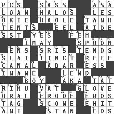 ACROSS 1. Personal Computers (abbr.) 4. Backtalk 8. White ___ sheet 11. Grant temporary use of 13. Auras 15. French article 16. Migrant worker of the '30s 17. White Person, in Hawaii 18. Hyperbolic tangent 19. Portable shelters 21. Snakelike fish 22. Assistant 23. Fast jet (abbr.) 24. Consenting reply 27. Opposite of masc. 29. "If ____ say so..." 30. Soup utensil 34. Followers of ems 36. Indian titles of respect 39. Watches over 40. Narrow board 41. Colored lightly or faintly 43. Coral collection 44. Lessep's creation 46. The sixth month of the Jewish calendar 47. Double-curved letter 48. Silly 49. Grant temporary use of 51. Male child 53. Alias (abbr.) 54. Make lace 57. Tall New Zealand timber tree 60. Large container 63. Michael Jackson trademark 65. Taken by mouth 66. Eat (away) 69. Greek god of love 70. Label 71. Biscuitlike quick bread 72. Give off 73. Black tropical American cuckoo 74. Comedian Laurel of Laurel & Hardy 75. Begley and Asner DOWN 1. Ground plans 2. Popular sodas 3. Virtuous person 4. Quiet! 5. Auto club (abbr.) 6. _ gin 7. Not divided or shared with others 8. Mountain range southwest of Kyrgyzstan 9. Post 10. American tennis player Robert 12. Remaining after all deductions 14. Automatic 18. ________ with (broke a safety seal) 20. Symbol (abbr.) 25. 90 degrees 26. Damascus' land 28. Eastern Standard Time (abbr.) 29. Byzantium, centuries later 31. Washington bills 32. Lyric poems 33. Overdraft (abbr.) 34. Liveliness 35. Nanny 37. Working for oneself (abbr.) 38. Any of the three canals of the cochlea 40. _-fi 42. Long journey 45. Lion 50. Tired old horse 52. Jacques Cousteau's middle name 54. Singer Mel 55. Shun 56. Trials 57. Roll call or roster of names 58. SW Asia republic 59. Wise men 61. Curves 62. A blast of a horn 64. Area sheltered from the wind 67. Heredity factor (abbr.) 68. Car or cant ending