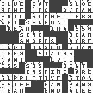 ACROSS 1. A slight indication 5. Consume 8. A type of plum 12. French philosopher Descartes 13. Lion 14. Sea 15. Tending to cause great harm 16. Wine waiters 19. Soggy 20. Commissioned military rank 21. Hitchcock's "____ Window" 23. Lyricist Gershwin 24. Compass dir. 27. Trig term 30. Letter starter 31. Sounds asleep 34. 43,560 square feet 35. Farming town in central California 38. Administered medicine 40. Comedian Laurel of Laurel & Hardy 41. Angers 42. Flight of steps 44. Patter 45. 57 in ancient Rome 46. Double-curved letter 47. Distress signal 50. Gouge 53. Stimulate to action 57. "We ___ not amused" (Victoria) 59. Supplying deficiencies 63. Portico 64. First name in cosmetics 65. Baking dish 66. Baking dishes 67. Lacerate 68. Conclusion 69. Toward shelter DOWN 1. Group working together 2. Prying instrument 3. Join together 4. Snakelike fish 5. Otherwise 6. A really long time 7. Heavy book 8. _-fi 9. Area sheltered from the wind 10. Rowing implement 11. Followers of ems 14. Water jar 17. Medical imaging device (abbr.) 18. Hearing organ 20. Amused look 22. Aid 24. Religious group 25. "Two Mules for Sister ____" 26. Songbird 28. Allow head to fall sleepily 29. Greek god of love 30. Hyrax 32. Eastern Standard Time (abbr.) 33. Lick closed 35. Louse (plural) 36. Mouths or openings 37. Hiding places for outlaws 39. HTML Container Element 43. Travel on or in a vehicle 47. Drop; flow; fall 48. Single 49. Fast jet (abbr.) 51. Relating to or accompanying birth 52. Heavy duty weighing machine 54. Corncob 55. _ the terrible 56. Tear apart 58. Relaxation 59. Put into a specified state 60. Purpose 61. Parent Teacher Association (abbr.) 62. For each 63. Health resort