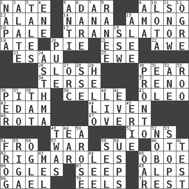ACROSS 1. Nathan's nickname 5. The sixth month of the Jewish calendar 9. In addition 13. Actor Alda or Thicke 14. Nanny 15. Amid 16. Diluted with white 17. Interpreter 19. Had dinner 20. Sliced dessert 21. Compass dir. 22. Deep reverence 23. He sold his birthright 25. She-sheep 26. Make a splashing sound 30. Lightbulb-shaped fruit 34. Laconic 35. Western Nevada city 36. Heart or essence 39. Cell (Danish) 42. Butter sub 43. Dutch treat 44. Make or become more lively 46. Round or rotation of duties 47. Unconcealed 48. Afternoon social gathering 51. Charged particles 54. Back 57. Armed conflict 58. Institute legal proceedings 60. Baseball player Mel 62. Frustrating wastes of time 65. Mitch Miller's instrument 66. Stares at amorously 67. Ooze 68. High mountains 69. Highlander 70. Snakelike fish 71. Remainder DOWN 1. California wine valley 2. Having winglike extensions 3. Falsehoods 4. Compass dir. 5. Opposed to 6. Have the gumption 7. Santa ___, CA 8. Indian princess (variant) 9. Wet nurse (var.) 10. Globular water bottle used in Asia 11. Frozen precipitation 12. Legendary monster 15. Toward shelter 18. Compass dir. 20. Whine 24. Respiratory problem 27. The grampus (Milton) 28. Compass dir. 29. Phone greeting 30. Right away 31. Snakelike fish 32. One (Scot) 33. Friend of Pooh 36. For each 37. Wedding promise 38. Make lace 40. 54 in ancient Rome 41. First lady 45. 4th largest of the Great Lakes 48. It was, poetically 49. Ewer handle 50. Came up 52. Impressive in appearance 53. Ceases 54. Tree-dwelling hopper 55. Capital of Latvia 56. Stare 58. Stitch closed the eyes of (a falcon) 59. United States Postal Service (abbr.) 61. Trial 63. Cartoonist voice _ Blanc 64. Area sheltered from the wind 65. Boat paddle