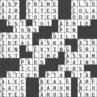 ACROSS 1. Viper 4. A-one 9. In addition 13. Title for a knight 14. Locates 15. Root beer relative 16. "We ___ not amused" (Victoria) 17. Lugs 18. Aroma 19. Eastern Standard Time (abbr.) 21. Small child 22. Nest on high 24. Charged atoms 26. Writing instrument 27. Porridge 29. Petroleums 30. Perfect 31. "____ silly question..." 33. Atmosphere 36. Car or cant ending 37. Imposing or collecting, as a tax 40. Indian title of respect (Mr.) 41. Fast jet (abbr.) 42. Citrus frut 43. Indian state 45. Groovy apts. 47. Aches 48. Frozen water 49. Possessive pronoun 50. Guide 52. Parent Teacher Association (abbr.) 54. Call ___ day 56. Actor Baldwin 57. Memphis, Tenn. Street 59. Sandy's bark 61. Yard entry 62. Composer Copland 63. Non-commissioned officer (abbr.) 64. Sight organs 65. Came up 66. Definite Article DOWN 1. White ___ sheet 2. Father 3. Elected leader of a country 4. Pacific Standard Time (abbr.) 5. Debaucheries 6. "Tell ____ the Marines!" 7. Rendezvous 8. Double-curved letter 9. Oak nuts 10. Farming town in central California 11. _ gin 12. Rowing implement 20. Ancient Roman robe 22. Bee-related 23. Snakelike fish 25. 1994 drama film starring Jodie Foster 27. Sliced desserts 28. Lyric poems 29. Migrant worker of the '30s 31. Deliberation 32. Symbol (abbr.) 33. Helper 34. SW Asia republic 35. Basketball hoops 38. A person who is older than you are 39. Stare wonderingly 44. Indian skirt 45. Components 46. Adept person 49. Saint headwear 50. Kill 51. False hair 52. Lightbulb-shaped fruit 53. Edible starchy tuberous root 55. Bowlike part 56. Mature 57. Sound made by sheep 58. Compass dir. 60. Enemy
