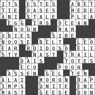 ACROSS 1. ___ a Wonderful Life 4. _____ Park, CO 9. Collude with 13. Make a knot 14. Fertile tracts in a desert 15. Ancient Persian 16. Black tropical American cuckoo 17. Lacking originality or spontaneity 18. Entreaty 19. Oval reproductive body of a fowl 21. Big collection agency 22. Sea 24. Part of speech 26. Spoil 27. Off-Broadway awards 29. Beget 30. Trap for birds or small mammals 31. Waist strap 33. Lion 36. Ewer handle 37. Noisy, rowdy, vocal (Spanish) 40. Connecticut Ivy Leaguer 41. Filthy place 42. Political cartoonist Thomas 43. Lag or linger behind 45. Raised platform 47. Lugs 48. Environmental prefix 49. "Silly old bear" 50. NE Netherlands city 52. Set 54. "___ Little Indians" 56. Jai _ 57. Person of subnormal intelligence 59. Strike 61. Naughty children 62. Join together 63. Compass dir. 64. Vertical spar for supporting sails 65. Honkers 66. Spanish title DOWN 1. Call ___ day 2. Prong on a fork 3. Signiory (variant) 4. Greek goddess of the dawn 5. Smooth fabric 6. Russian ruler of old 7. Snakelike fish 8. Compass dir. 9. Electrical Unit 10. Actor Lugosi 11. Paradise 12. Afternoon social gathering 20. Leaves 22. Leaves out 23. Auto 25. One who makes use of a thing 27. Singles 28. Water vessel 29. Narrow, elongated depression 31. Prejudice 32. Begley and Asner 33. Tough but pliablecoriaceous 34. Writer Wiesel 35. Petroleums 38. The state of being joined or united 39. Von Bismarck 44. Carrot, for example 45. Stop 46. Adept person 49. Secret plans 50. _ mater 51. Plant excrements 52. Went 53. One of the Great Lakes 55. Billionth: prefix 56. Direct toward a target or goal 57. Java container 58. Born 60. Animal enclosure
