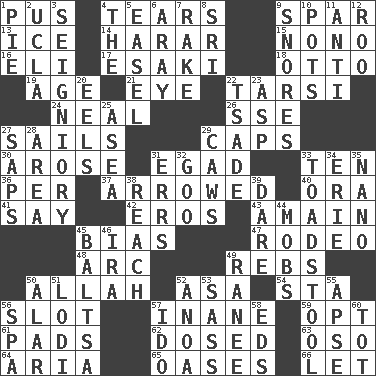 ACROSS 1. Product of festering 4. Pulls into pieces 9. Practice fight 13. Frozen water 14. Ethiopian city, capital of Harari 15. Words to Nanette 16. Biblical high priest 17. 1973 Nobel Price Winner (Physics) Leo 18. Von Bismarck 19. Personal question 21. Sight organ 22. Tarsus (plural) 24. Actress Patricia 26. Compass dir. 27. Moves on water 29. Smile enhancers 30. Came up 31. Mild oath 33. Nine, plus one 36. For each 37. Moved like an arrow 40. Mouth or opening 41. Declare 42. Greek god of love 43. At full speed 45. Prejudice 47. Cowboy competition 48. Curve 49. Confederate soldiers (slang) 50. Assad's deity 52. White ___ sheet 54. R.R. building 56. Notch 57. Silly 59. Choose 61. Groovy apts. 62. Administered medicine 63. Bear (Spanish) 64. Roberta Peters solo 65. Fertile tracts in a desert 66. Allow DOWN 1. Sliced dessert 2. Southern CA. univ. 3. Signiory (variant) 4. Definite Article 5. Artist's stand 6. Like ___ of sunshine 7. Immoral or dissolute person 8. _ Lanka 9. Sounds asleep 10. Plant holders 11. Opposed to 12. Friend of Pooh 20. Snakelike fish 22. Sadhe (variant) 23. Viper 25. At sea 27. Plant excrements 28. Length times width 29. Crow sounds 31. Blunders 32. Thick or sticky substance 33. Inedible or poisonous agaric 34. 4th largest of the Great Lakes 35. Billionth: prefix 38. Arrive at 39. Have the gumption 44. Crowds into 45. Greek mezzo-soprano Agnes 46. Lyricist Gershwin 49. Indian princess (variant) 50. Having or resembling wings 51. Farming town in central California 52. Small Philippine buffalo 53. Backtalk 55. Domed church section 56. Health resort 57. Wedding promise 58. Begley and Asner 60. Small child