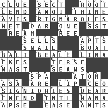 ACROSS 1. A slight indication 5. Religious group 9. Carrot, for example 13. Grant temporary use of 14. Mine, in Marseilles 15. One or ones belonging to thee 16. Deliberation 17. Frustrating wastes of time 19. Was introduced to 20. Boat paddle 21. Single 22. Fast jet (abbr.) 23. 480, 500 or 516 sheets of paper 25. To separate or throw off 26. Makes a sale 30. Tenement units (abbr.) 34. Slow-paced one 35. Water vessel 36. Indonesian resort city 39. Calif. Air Force Base 42. Pale green bean 43. Supplements with great effort 44. Laconic 46. Political cartoonist Thomas 47. Seines 48. Health resort 51. Smallest unit of an element 54. White ___ sheet 57. "We ___ not amused" (Victoria) 58. Mouth edge 60. Corporate head (abbr.) 62. Seigniories (variant) 65. Letter starter 66. Make improvements or corrections to 67. International (abbr.) 68. Nanny 69. Domed church section 70. Comfort 71. Pismires DOWN 1. Burrowing marine mollusk 2. Prying instrument 3. Join together 4. Begley and Asner 5. "Two Mules for Sister ____" 6. Independent ruler or chieftain 7. Gear tooth 8. Southeast Indonesia island 9. 17th letter of the Greek alphabet 10. Lubricates 11. Washington bills 12. Trial 15. Woody plant 18. One (Scot) 20. Sign of things to come 24. Help 27. Experiment locale 28. Falsehood 29. Narrow boards 30. Most capable 31. Luau course 32. Scottish cap 33. R.R. building 36. Benjamin's nick name 37. Alias (abbr.) 38. French article 40. Area sheltered from the wind 41. Period 45. Fastener 48. Stated 49. Adept person 50. Nest on high 52. Sea 53. Intended 54. Toward the sea 55. Simple or foolish person 56. Eons 58. Allows 59. Capri or Wight 61. Mouths or openings 63. Compass dir. 64. _ tizzy (2 wds.) 65. Heredity factor (abbr.)