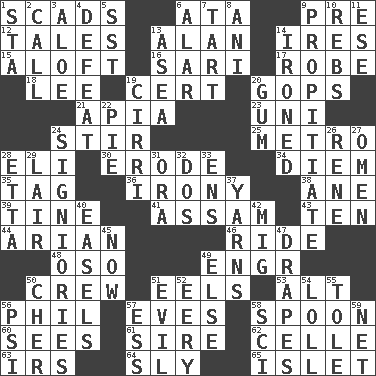 ACROSS 1. Large numbers or amounts 6. "One Day ___ Time" 9. Before (prefix) 12. Falsehoods 13. Actor Alda or Thicke 14. Angers 15. High up in or into the air 16. Indian skirt 17. Loose flowing garment 18. Area sheltered from the wind 19. Foregone conclusion 20. Republicans 21. Capital of Western Samoa 23. Single; one (prefix) 24. Tumult 25. Paris' subway 28. Biblical high priest 30. Eat (away) 34. South Vietnam president (1954) 35. Label 36. Literary sarcasm 38. One (Scot) 39. Prong on a fork 41. Indian state 43. "___ Little Indians" 44. Believer in; advocate of (suffix) 46. Travel on an animal 48. Bear (Spanish) 49. Engineer (abbr.) 50. Group working together 51. Snakelike fish 53. The first octave above the treble staff 56. Silvers or Donahue 57. Nights before holidays 58. Soup utensil 60. Perceives with the eye 61. The founder of a family 62. Cell (Danish) 63. Big collection agency 64. Insidious 65. Small island DOWN 1. R.R. building 2. Give a ring to 3. Medicinal plant 4. Outscore 5. Fast jet (abbr.) 6. Having or resembling wings 7. Small pie 8. Cuckoo 9. Appease 10. Confederate soldiers (slang) 11. Compass dir. 13. At sea 14. Pressed 19. High-altitude cloud 20. Chewing product 22. Sliced dessert 24. Seigniories (variant) 26. French philosopher Descartes 27. Sign of things to come 28. Singer James 29. Den 31. Mouth or opening 32. Two (Sp.) 33. Followers of ems 37. Tall tales 40. Artist's stands 42. Russian fighter aircraft 45. At this time 47. Window treatments 49. Otherwise 50. "Mermaids" star 51. Tending to cause great harm 52. Suggestive of the supernatural 54. Hang loosely or laxly 55. Lacquered or enameled metalware 56. 23rd letter of the Greek alphabet 57. Double-curved letter 58. _-fi 59. Fish or hair follower