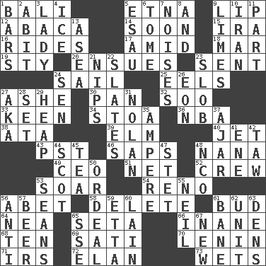 ACROSS 1. Indonesian resort city 5. Inactive volcano in Sicily 9. Mouth edge 12. Phillipine bananalike plant 14. Within a short period 15. Retirement account (abbr.) 16. Amusement-park features 17. Among 18. Make imperfect 19. Filthy place 20. Takes place subsequently 23. Posted 24. Travel by water 25. Snakelike fish 27. American tennis player Robert 30. Baking dish 32. "Barney Miller" actor Jack 33. Peachy ____! 34. Portico 36. Basketball assoc. 38. "One Day ___ Time" 39. Shade tree 40. Type of plane 43. Pacific Standard Time (abbr.) 46. Plant excrements 48. Nanny 49. Corporate head (abbr.) 51. Remaining after all deductions 52. Group working together 53. Fly high 54. Western Nevada city 56. Collude with 58. Keyboard key 61. Partially opened flower 64. Teachers' org. 65. Bristle 66. Empty; void 68. "___ Little Indians" 69. Suttee (variant) 70. Soviet premier 1918-24 71. Big collection agency 72. Flair 73. Moistens DOWN 1. Long, evenly shaped pieces 2. "This won't hurt ____!" 3. Kenny Rogers chart-topper in '80 4. Frozen water 5. Son of Isaac 6. Heavy book 7. Annoying sounds 8. Also 9. Citrus fruits 10. SW Asia republic 11. Component 13. Toward the sea 21. Cuts off 22. Chalkboards 23. Oscar Madison type 24. Elected rep. 26. Period of immesurable duration 27. Alias (abbr.) 28. Arrange properly for use 29. Pile 31. Pitcher Ryan 35. Electrical Unit 37. Partly open 41. Compass dir. 42. The 23rd letter of the Hebrew alphabet 44. Native of Scotland 45. Beverage made from leaves 47. Proofreading order 48. Non-commissioned officer (abbr.) 50. Severe or trying experience 53. Actors Connery and Penn 55. Famous astronaut Armstrong 56. Opposed to 57. Fermented drink made from hops 59. Singer James 60. (Had) reclined 61. Object of repulsion 62. A single undivided whole 63. Lairs 65. Compass dir. 67. ___ Haven, CT