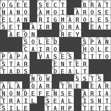 ACROSS 1. Double curve, resembling the letter S 5. Religious group 9. Naughty child 13. Billionth: prefix 14. Mine, in Marseilles 15. Came up 16. Enthusiasm 17. Complicated, petty procedures 19. Put into a specified state 20. Wind 21. Mouth or opening 22. Erode 23. Period of immesurable duration 25. Marina Del _, California 26. Having a sole or soles 30. Connect, as a bridge 34. Capital of Egypt 35. Hollow 36. Dad 39. Flower holders 42. "Tell ____ the Marines!" 43. Play the lead 44. Keyboard key 46. Small amounts or degrees 47. Started a card game 48. At this time 51. Fast planes 54. Wing 57. Rowing implement 58. Definite Article 60. Ewer handle 62. Unrelated to defense, as in spending 65. Operatic vocal solo 66. Lag or linger behind 67. Lick closed 68. Is not 69. Drop; flow; fall 70. Canvas cover 71. False hair DOWN 1. Singles 2. An organ shaped like a helmet 3. Related on the mother's side 4. Period of immesurable duration 5. Indian skirt 6. Independent ruler or chieftain 7. Gear tooth 8. The easternmost of the Lesser Sundas 9. Sis' sibling 10. Hero or heavy, e.g. 11. Toward the sea 12. Trial 15. Like ___ of sunshine 18. "We ___ not amused" (Victoria) 20. Small Philippine buffalo 24. Motion picture awards 27. 54 in ancient Rome 28. Epoch 29. Administered medicine 30. Upper-body garments 31. Plant holder 32. The first octave above the treble staff 33. Modern: prefix 36. Pacific Standard Time (abbr.) 37. _ moment's notice (2 wds.) 38. Writing tablet 40. Compass dir. 41. R.R. building 45. Otherwise 48. Christmas carol 49. Clumsy lout 50. Take or capture by force 52. Laconic 53. Inhabitant of Heaven 54. Pismires 55. Australian parrot (variant) 56. Of or related to the anus 58. Russian ruler of old 59. Aid 61. Assign a rank or rating to 63. Pass on 64. Teachers' org. 65. Small island