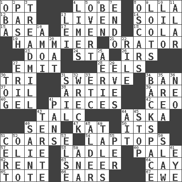 ACROSS 1. Choose 4. Ear part 8. Rounded earthenware pot or jar 12. Tavern 13. Make or become more lively 14. Land 15. At sea 17. Make improvements or corrections to 18. Root beer relative 19. More overdramatic by comparison 21. Speaker 23. ___ good deed 24. R.R. building 26. Big collection agency 27. Send forth 28. Snakelike fish 30. Three (prefix) 31. Turn aside suddenly 34. Bar 37. Lubricate 38. Nick name for Arthur 39. "We ___ not amused" (Victoria) 40. Set 41. Parts 42. Corporate head (abbr.) 43. Baby powder 44. "____ silly question..." 46. Elected rep. 47. Krazy ___ of comics 50. It is 51. Unrefined 54. Portable computers 57. Writer Wiesel 58. Dipping utensil 60. Light colored 62. Monthly bill 63. Scornful expression 64. Island 65. Haul 66. Hearing organs 67. She-sheep DOWN 1. Chief or king in Benin or Nigeria 2. Romantic infatuation 3. Excercise machine 4. Citrus fruits 5. Unconcealed 6. Benjamin's nick name 7. Inside; within (prefix) 8. Motion picture awards 9. Plunders 10. _ and Stitch 11. Having or resembling wings 13. Luau accessory 16. Mine, in Marseilles 20. Floor covering 22. Cause heat under the collar 25. Nest on high 27. One of the Great Lakes 29. Nights before holidays 30. Coat; cloak 31. Move on water 32. Raze 33. And so on (abbr.) 34. Keyboard key 35. Length times width 36. Modern: prefix 41. Baking dishes 43. Cylindrical with tapered ends 44. Small island 45. Halt 46. Inhabitant of Heaven 48. Tree or shrub in the Birch family 49. Lies 51. An absolute certainty 52. Butter sub 53. Otherwise 55. For each 56. Cole _ (cabbage dish) 59. Santa ___, CA 61. Sight organ