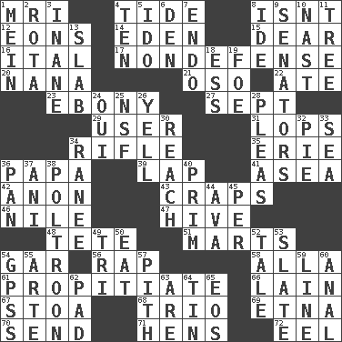 ACROSS 1. Medical imaging device (abbr.) 4. Periodic rise and fall of the sea level 8. Is not 12. Immeasurably long periods of time 14. Paradise 15. Letter starter 16. Slanted text style (abbr.) 17. Unrelated to defense, as in spending 20. Nanny 21. Bear (Spanish) 22. Had dinner 23. Dark wood 27. Back-to-school mo. 29. One who makes use of a thing 31. Chops off 34. Ransack; plunder; pillage 35. One of the Great Lakes 36. Dad 39. Pet locale 41. At sea 42. At once, immediately (arch.) 43. Dice game 46. Mediterranean tributary 47. Hub of activity 48. False hair 51. Shops 54. Slender fish 56. Reproach for some lapse or misdeed 58. Silent film actress Nazimova 61. Appease 66. (Had) reclined 67. Portico 68. Musical group of three 69. Inactive volcano in Sicily 70. Post 71. Coop moms 72. Snakelike fish DOWN 1. Chow _ 2. Round or rotation of duties 3. Silly 4. Nine, plus one 5. Wedding promise 6. Lair 7. Inside; within (prefix) 8. Binary compound 9. Legislators 10. Political cartoonist Thomas 11. Relationship diagram 13. Thick slice 18. Curvy letter 19. Enemy 24. Fr. "Yes" 25. Science/research agcy. 26. Shout 28. Entreaties 30. Arrive at 32. Sliced dessert 33. Ocean 34. Indian princess (variant) 36. Baking dish 37. Black tropical American cuckoo 38. Characterized by complete cowardliness 40. Demure 44. Actress Gardner 45. For each 49. Three (prefix) 50. Erode 52. Lie 53. Chalkboard 54. Global Positioning Systems (abbr.) 55. Johnson of "Laugh-In" 57. Essential or central part 59. Actor's bit 60. Of or related to the anus 62. Writing tablet 63. "We ___ not amused" (Victoria) 64. Shallow baking pan 65. Greek goddess of the dawn