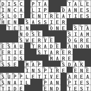 ACROSS 1. Compact _ 5. Parent Teacher Association (abbr.) 8. Lie 12. South American Indian 13. Mouth edge 14. Natives or inhabitants of Denmark 15. Position in a hierarchy or organization 16. Pleas 19. Layer 20. More lively and spirited 21. Adolescent 23. Single 24. R.R. building 27. Olfactory organ 30. Thailand, formerly 31. Turn aside suddenly 34. Legendary monster 35. Son of Isaac 38. Exchange 40. At once, immediately (arch.) 41. One of the Great Lakes 42. A viewer who gazes fixedly 44. Hats (slang) 45. Female horse 46. Compass dir. 47. Atlas unit 50. Neighbor of Neb. 53. Stimulate to action 57. Compass dir. 59. Supplementary 63. Length times width 64. Slow-paced one 65. Baking dish 66. Sliced desserts 67. Periodic rise and fall of the sea level 68. Conclusion 69. Trial DOWN 1. Food container 2. An arm off of a larger body of water 3. Biscuitlike quick bread 4. Domesticated feline 5. Entreaty 6. Metal containers 7. Flats, for short 8. Make lace 9. Black tropical American cuckoo 10. Area sheltered from the wind 11. Curvy letter 14. Have the gumption 17. River (Sp.) 18. Car or cant ending 20. Frozen precipitation 22. Takes place subsequently 24. Signal 25. Pacific island yam 26. So be it 28. Arrange properly for use 29. Blunders 30. Flew 32. Large container 33. Dutch treat 35. Snakelike fish 36. Indian titles of respect 37. Helper 39. Period 43. Celtic language 47. Place where flour is made 48. A saturated hydrocarbon 49. Pacific Standard Time (abbr.) 51. Nest on high 52. Leg joints 54. Corncob 55. _ the terrible 56. Tear apart 58. 90 degrees 59. Fast jet (abbr.) 60. Corn or form start 61. Groovy apt. 62. Sliced dessert 63. Fitting