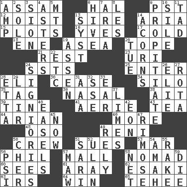 ACROSS 1. Indian state 6. Actor Linden 9. Pacific Standard Time (abbr.) 12. Damp 13. Male parent of an animal 14. Operatic vocal solo 15. Graphs 16. Jacques Cousteau's middle name 17. Having a low temperature 18. Compass dir. 19. At sea 20. Drink excessively 21. Repose 23. RI univ. 24. Fast planes 25. Keyboard key 28. Connecticut Ivy Leaguer 30. Stop 34. Grain storage tower 35. Label 36. Rhinal 38. Small island 39. Prong on a fork 41. Nest on high 43. Beverage made from leaves 44. Believer in; advocate of (suffix) 46. Greater amount 48. Bear (Spanish) 49. Painter Guido (1575-1642) 50. Ship's personnel 51. Takes to court 53. Third mo. 56. Silvers or Donahue 57. Shopping center 58. Roamer 60. Perceives with the eye 61. Like ___ of sunshine 62. 1973 Nobel Price Winner (Physics) Leo 63. Big collection agency 64. Acquire through effort 65. Giggle DOWN 1. Electrical Unit 2. Not divided or shared with others 3. The Jewish people; Israel 4. Michaelmas daisies 5. Mountains (abbr.) 6. Hub of activity 7. Type of rug 8. French article 9. Appease 10. Drop; flow; fall 11. Small boy 13. System (abbr.) 14. Oak nuts 19. NE Netherlands city 20. Third day of the wk. 22. And so on (abbr.) 24. Seigniories (variant) 26. Writer Wiesel 27. Roll call or roster of names 28. Singer James 29. Den 31. Auto club (abbr.) 32. Compass dir. 33. Ewer handle 37. Citrus fruits 40. Artist's stands 42. A really long time 45. Immediately 47. Full of chinks, cracks, or crevices 49. Have confidence or faith in 50. "Mermaids" star 51. Indian skirt 52. ____ Bator 54. Wet nurse 55. Libertine 56. Air pressure measure (abbr.) 57. Informal term for the mouth 58. Remaining after all deductions 59. Expire
