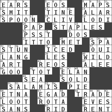 ACROSS 1. Hearing organs 5. Greek goddess of the dawn 8. Atlas contents 12. Stricken, poetically 13. Prong on a fork 15. Having or resembling wings 16. Soup utensil 18. 154 in Roman numerals 19. Farming town in central California 20. Infant food 22. Paper fasteners 24. Inconspicuous attention getter 26. Two (Sp.) 27. "Tell ____ the Marines!" 28. Was introduced to 29. Health resort 32. Astound 35. On the rocks 37. Fr. "Yes" 38. Long (Scottish) 39. French article 40. Rampant 41. Nonscientific branch of learning 42. Vintage cars 43. Toward shelter 44. Thick or sticky substance 45. Small child 46. Style 49. Ocean 50. Disposed of to a purchaser 51. Deli grouping 55. Sliced dessert 56. Inactive volcano in Sicily 57. Mild oath 59. Buy and sell 63. Plunder 64. Round or rotation of duties 65. Nights before holidays 66. Without 67. To free from 68. Monthly bill DOWN 1. Double-curved letter 2. Electrical Unit 3. River (Sp.) 4. Discontinuing 5. And so on (abbr.) 6. Lubricates 7. In a ____ (agitated or irritated) 8. Shopping centers 9. Medicinal plant 10. Groovy apts. 11. _ Lanka 14. Eluded 17. Political cartoonist Thomas 21. Pacific Standard Time (abbr.) 23. Plant holder 25. Bathroom plumbing fixture 28. Makes clutter 29. Land 30. Whimper 31. Assistant 32. Volcanic refuse 33. Pacific island yam 34. To (old English) 36. Corporate head (abbr.) 40. Nomad 42. Nomad 45. Afternoon social gathering 47. Chop off 48. Came down and settled, as after flight 49. Narrow boards 51. Portico 52. Soon (poet.) 53. Composer Stravinsky 54. Suttee (variant) 56. Raised railways 58. Male parent 60. "___ Maria" 61. Lair 62. Eastern Standard Time (abbr.)