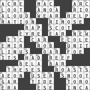 ACROSS 1. Land measure 5. Apple computer (short form) 8. Curve 11. Spoils 12. Small Philippine buffalo 14. _ de Janeiro 15. Verbally 17. Erode 18. Assist 19. Food allowance for one day 21. Full of chinks, cracks, or crevices 23. Reproach for some lapse or misdeed 25. Native of Scotland 26. Jane of fiction 27. Hearing organ 28. ___ Haven, CT 31. And so on (abbr.) 33. Automobile 35. Learning spot: Fr. 37. Independent ruler or chieftain 38. Director Reiner 40. A single undivided whole 41. "_ and Lucy" (Charlie Brown theme song) 43. Rowing implement 45. Enemy 46. It is 47. Possessed 50. Coral collection 52. Actor Lugosi 53. Tavern 54. College papers 56. Exposes to great heat 61. A really long time 62. One who uses or employs something 65. Snout, nose 66. Slender fish 67. Periodic rise and fall of the sea level 68. "Corrida" creature 69. Epoch 70. Compass dir. 71. South American Indian DOWN 1. Having or resembling wings 2. Root beer relative 3. Carrot, for example 4. Needle case 5. Opening into something insatiable 6. A saturated hydrocarbon 7. Rough 8. Ancient Greek god of war 9. Cause heat under the collar 10. Police officer (slang) 13. N. Chile seaport 16. Rowboat 18. Being at a high temperature 20. Drug cop 22. Greater amount 24. Lightbulb-shaped fruit 26. Shade of tan 28. Words to Nanette 29. Writer Wiesel 30. Soggy 31. Send forth 32. Airtight sealed metal containers 34. Friend of Pooh 36. _ links 37. Connecticut Ivy Leaguer 39. Sharp remark 42. "______ My Girl" (Turtles hit) 44. Tail end 48. Eskimo relative 49. Small ungulate mammals of Africa 51. Greek god of love 52. Benjamin's nick name 54. Pull into pieces 55. Israeli folk dance 57. Against 58. Within a short period 59. Torque (variant) 60. Portico 61. Grow older 63. Begley and Asner 64. To sift
