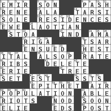 ACROSS 1. Arab leader 5. Male child 8. Romantic infatuation 12. French philosopher Descartes 13. According to 14. Tarsus (plural) 15. Not divided or shared with others 16. Homes 19. She-sheep 20. Of or relating to Laos or its people 21. Portico 23. Indiana (abbr.) 24. Nanny (var.) 27. Capital of Latvia 30. Russian ruler of old 31. Took place subsequently 34. Command 35. Slanted text style (abbr.) 38. Columnist Joseph or Stewart 40. Assign a rank or rating to 41. Teases 42. Keyboard key 44. 4th largest of the Great Lakes 45. Woody plant 46. Put into a specified state 47. Eastern Standard Time (abbr.) 50. Fast planes 53. Curse 57. Wind 59. Census information 63. Competent 64. Debaucheries 65. Allow head to fall sleepily 66. Within a short period 67. Writer Wiesel 68. Begley and Asner 69. Mail DOWN 1. Celtic language 2. Catcalls? 3. An arm off of a larger body of water 4. To separate or throw off 5. "Two Mules for Sister ____" 6. Margarine 7. Political cartoonist Thomas 8. Baking dish 9. Curve 10. Compass dir. 11. Part of HMS, perhaps 14. Look after 17. One more than two 18. One of the 12 tribes of Israel 20. (Had) reclined 22. Threatening words 24. Toward the sea 25. Vertical spar for supporting sails 26. Johnson of "Laugh-In" 28. Girls' org. (abbr.) 29. Old (Scot.) 30. Triads 32. Compass dir. 33. Stupid person 35. Angers 36. Become fatigued 37. "This won't hurt ____!" 39. For each 43. Trial 47. Snakelike fish 48. Health resort 49. Teat (slang) 51. Off limits 52. Grain storage towers 54. Prong on a fork 55. Parka part 56. Extremities 58. Monthly bill 59. Before (prefix) 60. Lubricate 61. Luau course 62. Shoshoni 63. Cleo's killer