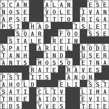 ACROSS 1. Examine hastily 5. Actor Alda or Thicke 9. Compass dir. 12. Characteristic smell of wine 13. Grand slam 14. _ the terrible 15. Domed church section 16. "Tell ____ the Marines!" 17. Port city in Latvia 18. Air pressure measure (abbr.) 19. Possessed 21. Small island 22. Fly high 24. Egg _ yung 26. Compass dir. 27. Lacking originality or spontaneity 28. It's straight from the horse's mouth 29. Petty quarrel 30. Satellite of Uranus 32. Connecting point 36. Hyperbolic tangent 37. Indiana (abbr.) 38. One who makes use of a thing 39. Pismires 40. With motion or animation 42. Inactive volcano in Sicily 43. Assign a rank or rating to 44. All-night dance parties 46. Pacific Standard Time (abbr.) 49. It is 50. At once, immediately (arch.) 51. Hold, grip (Informal) 53. Connecticut Ivy Leaguer 54. Fast jet (abbr.) 57. Suttee (variant) 58. 154 in Roman numerals 61. Pale green bean 62. Woody plant 63. Helper 64. Tending to cause great harm 65. Begley and Asner 66. Jacques Cousteau's middle name 67. Wig DOWN 1. Fastener 2. 911 reaches them 3. Helper 4. Born 5. Enthusiastic 6. Car dealer's back yard 7. Keyboard modifier key 8. Modern: prefix 9. Vices 10. Gurus 11. Related on the mother's side 14. Big collection agency 19. Actor Linden 20. Type of rug 21. Electrically charged atom 23. Profane or obscene expressions 24. Eats 25. Lubricate 27. Connect, as a bridge 28. Remove soap 29. R.R. building 31. Disturbances 32. New (sp.) 33. Clearly or manifestly demonstrative 34. Hiding places for outlaws 35. Epoch 40. Floor protector 41. Of the mouth 43. To free from 45. Cuckoo 46. Thick mixture 47. Broken piece 48. Lugs 52. Whopper 53. Nights before holidays 55. Stricken, poetically 56. Falsehood 58. Island 59. 54 in ancient Rome 60. Binary compound 61. Allow